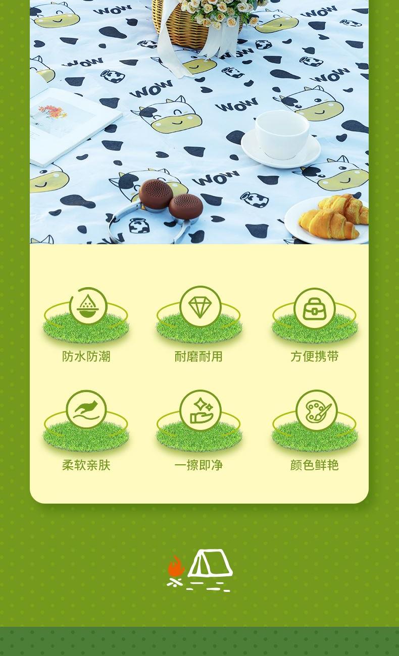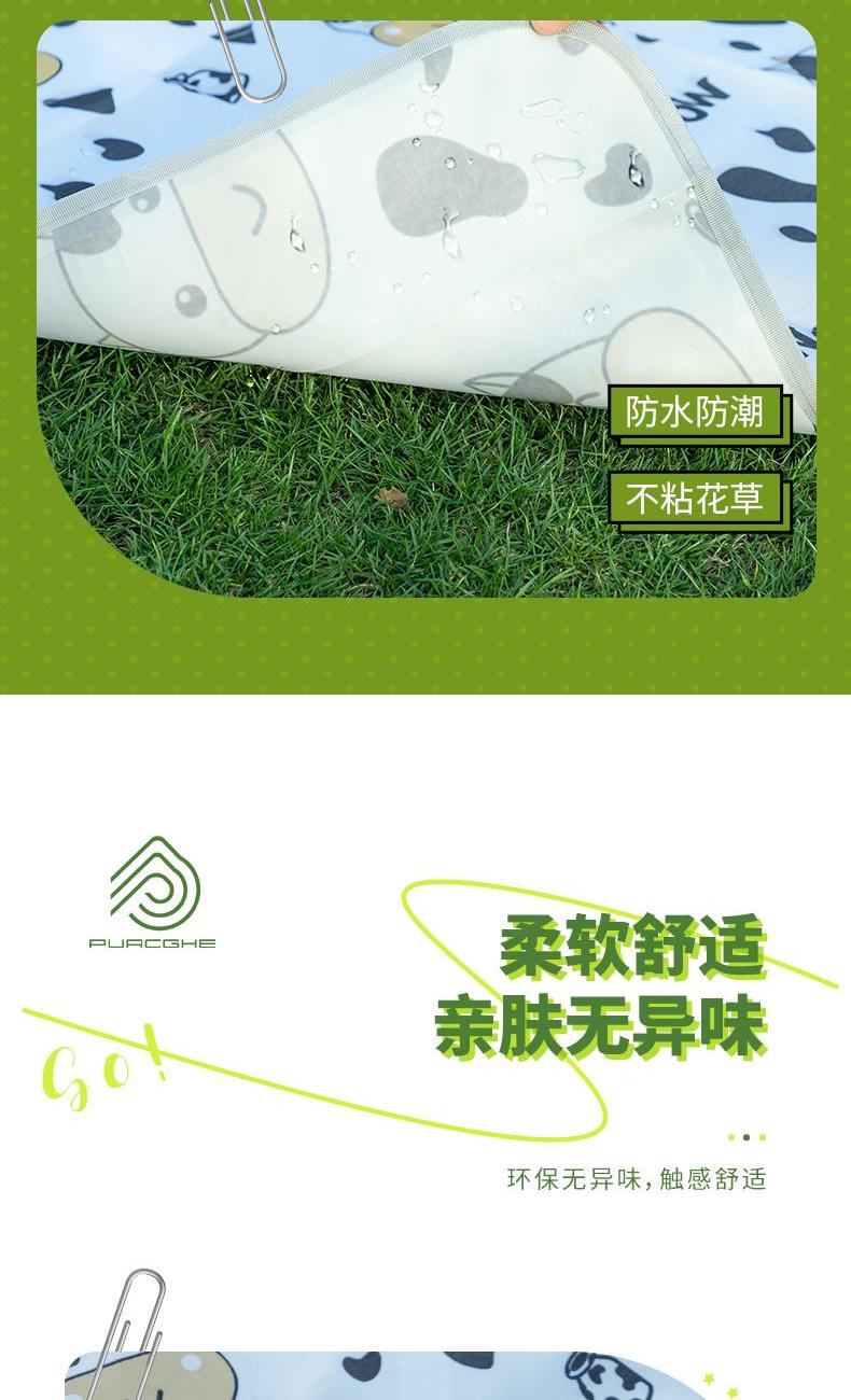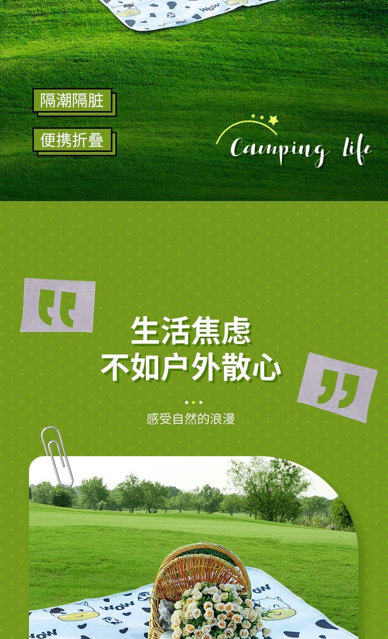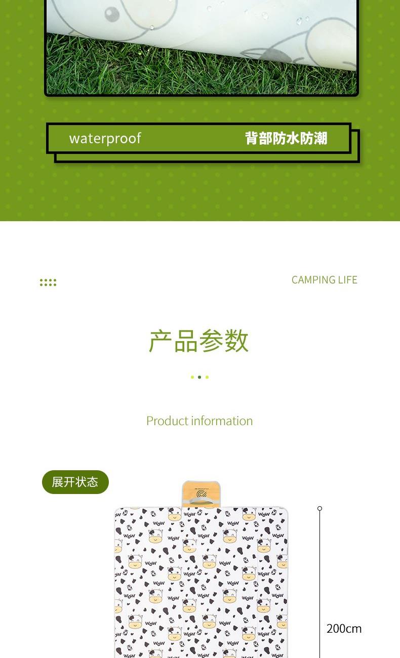 产品特点说明 : 一体式收纳携带方便 轻松出行 加厚防潮 便携易收纳 易清洗 加密加厚面料柔软舒适 防水防潮不易粘草 避免渗水遇水不吸收