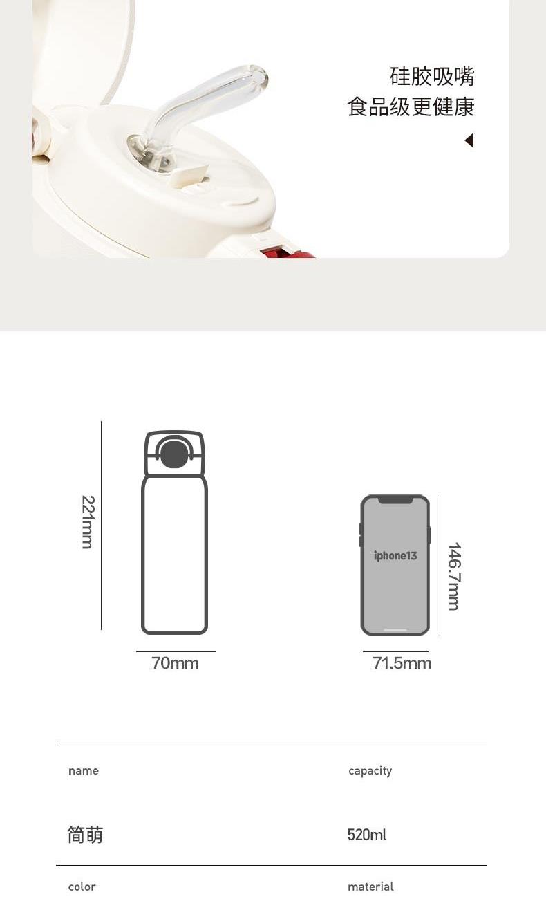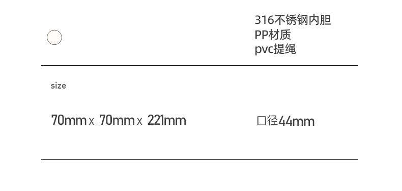 容量:520ml|净重:308g口径:44mm材质:316不锈钢(内胆)304不锈钢(外壳)PP(杯盖)产品尺寸:70mm*70mm*221mm