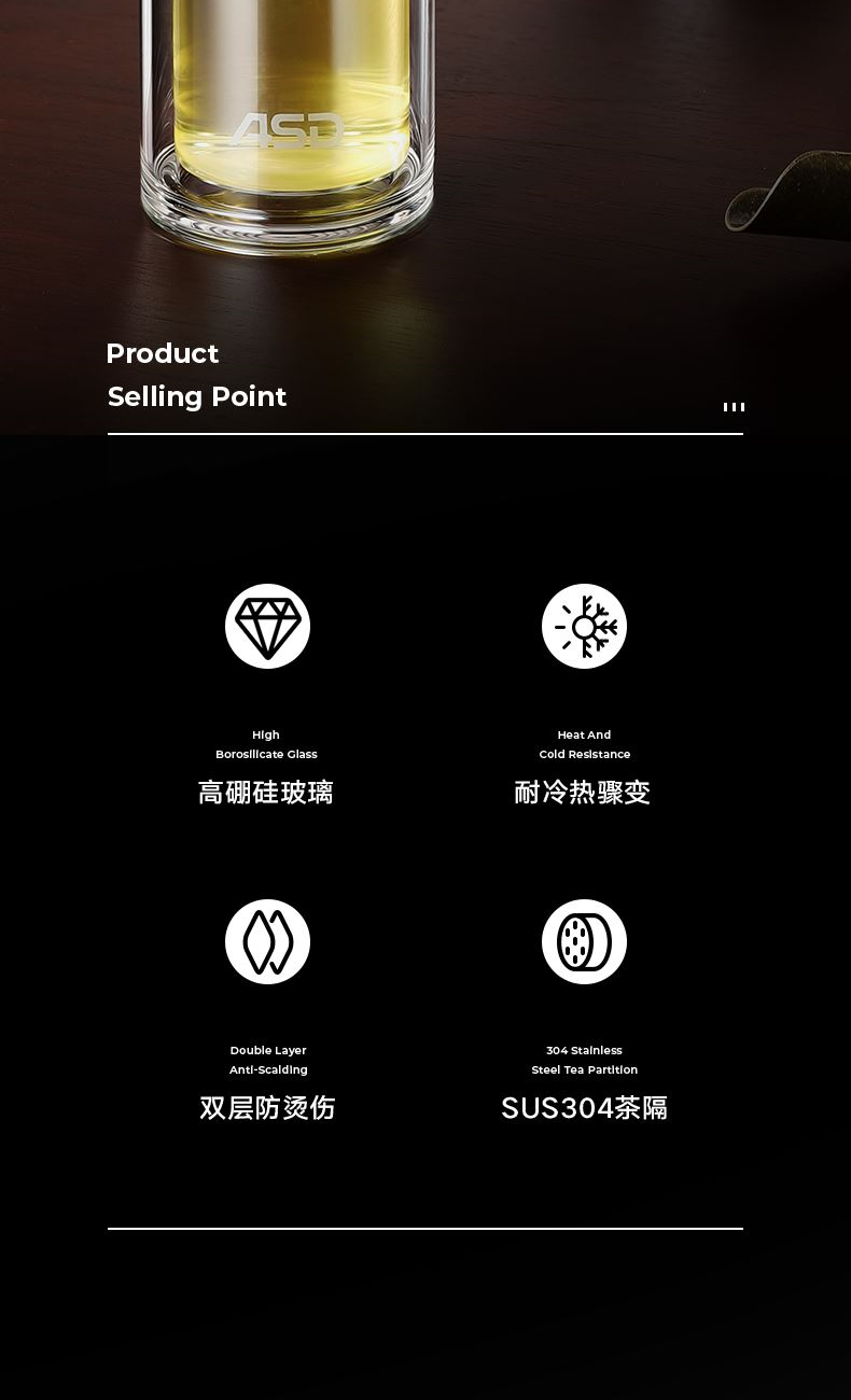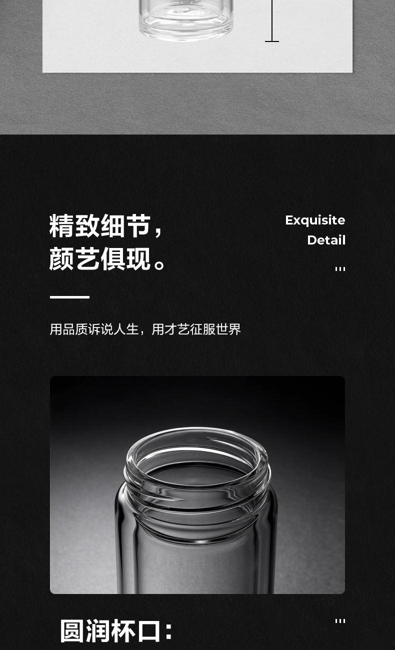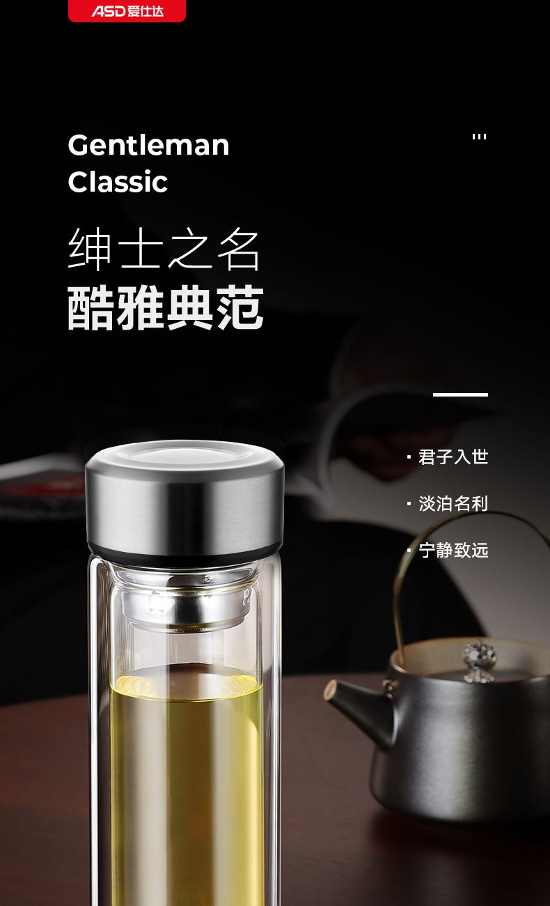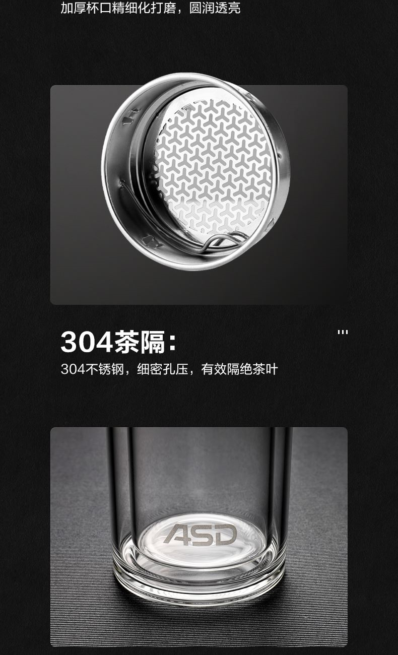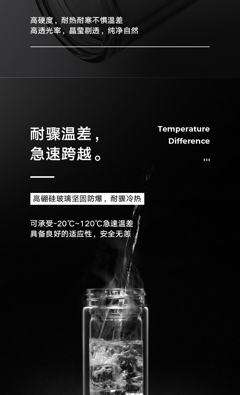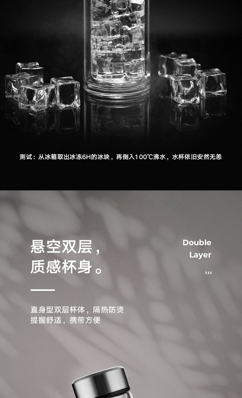 材质 - 高硼硅玻璃 规格 - 320ml 内箱 - 72*72*207mm(彩盒) 外箱 - 460*315*250mm 净重 - 8.9kg 毛重 - 11kg 条码 - 6921880754590 高硼硅玻璃耐冷热骤变双层杯体 304滤网