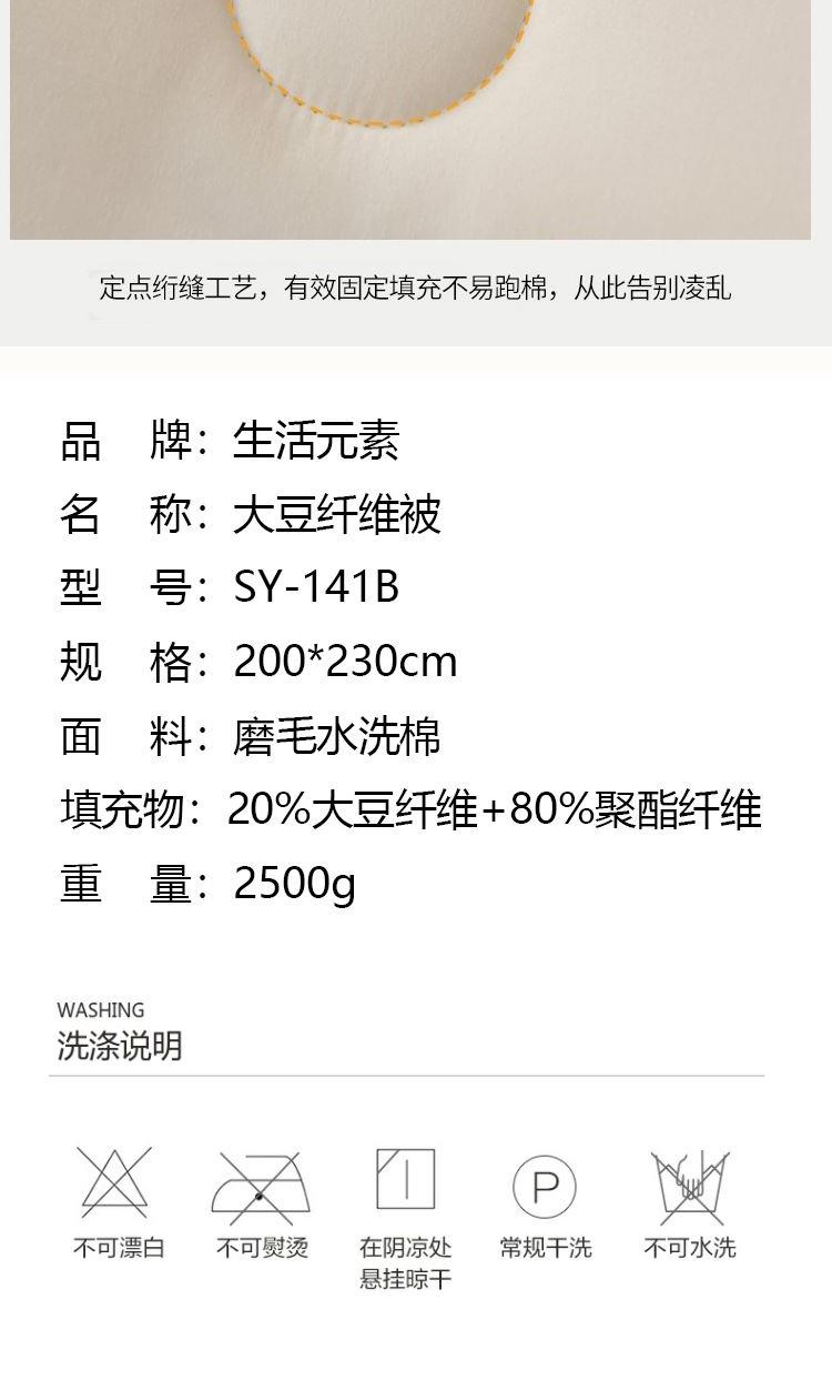花色:白色 规格:200*230cm 面料:磨毛水洗棉 填充物:20%大豆纤维+80%聚酯纤维 重量:2500g 包装方式:无纺布袋 1、大豆纤维主要由大豆蛋白质组成,吸汗透气,手感细腻软糯,同时富含多种氨基酸,被誉为新世纪的健康舒适纤维” 2、大豆纤维被的特点:蓬松,不板结,大豆蛋白纤维填充,具有羊绒般柔软手感,棉的保暖性和蚕丝般的贴肤性。