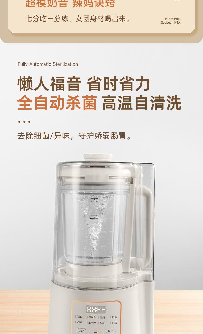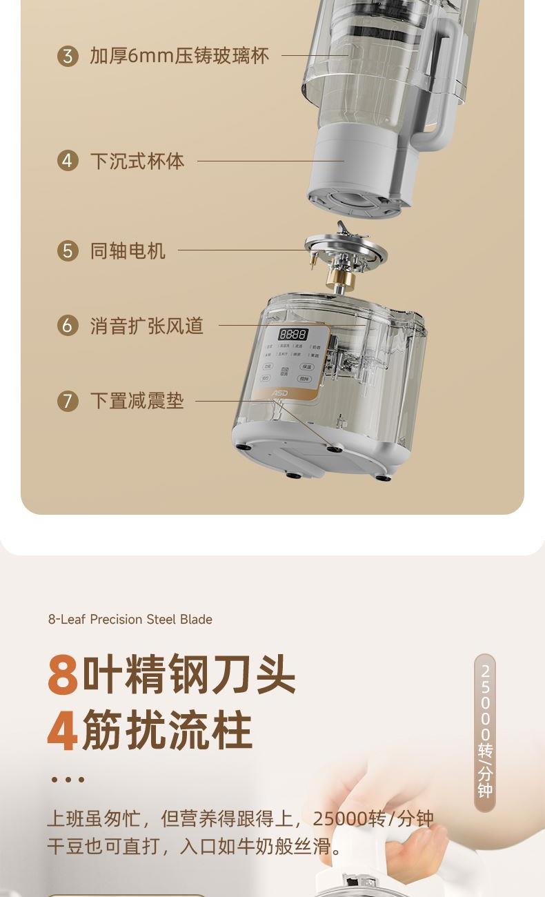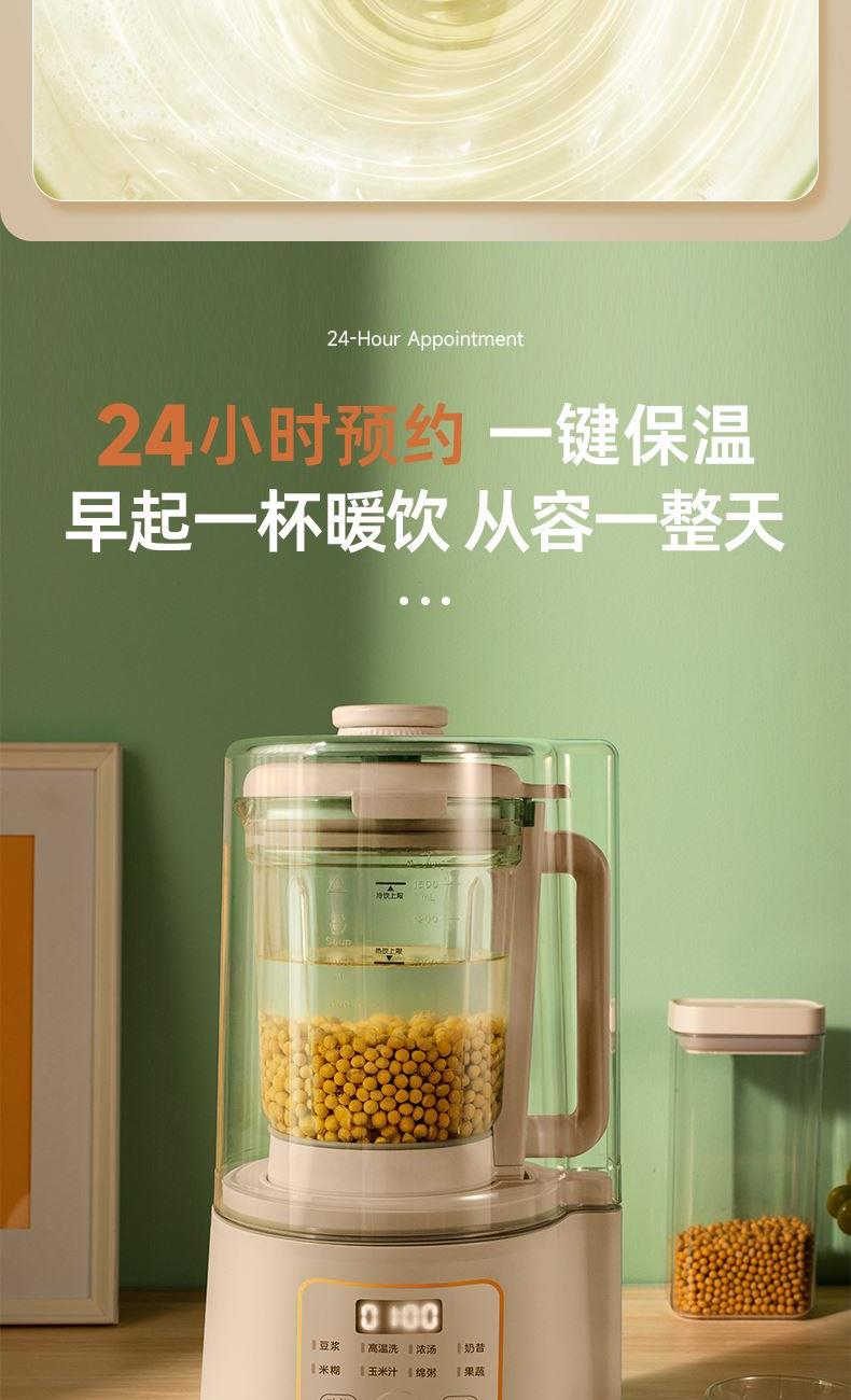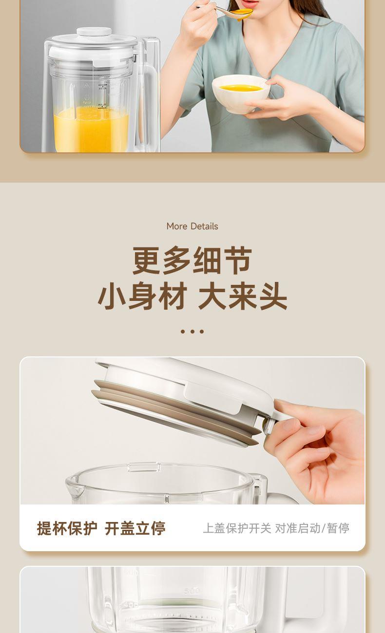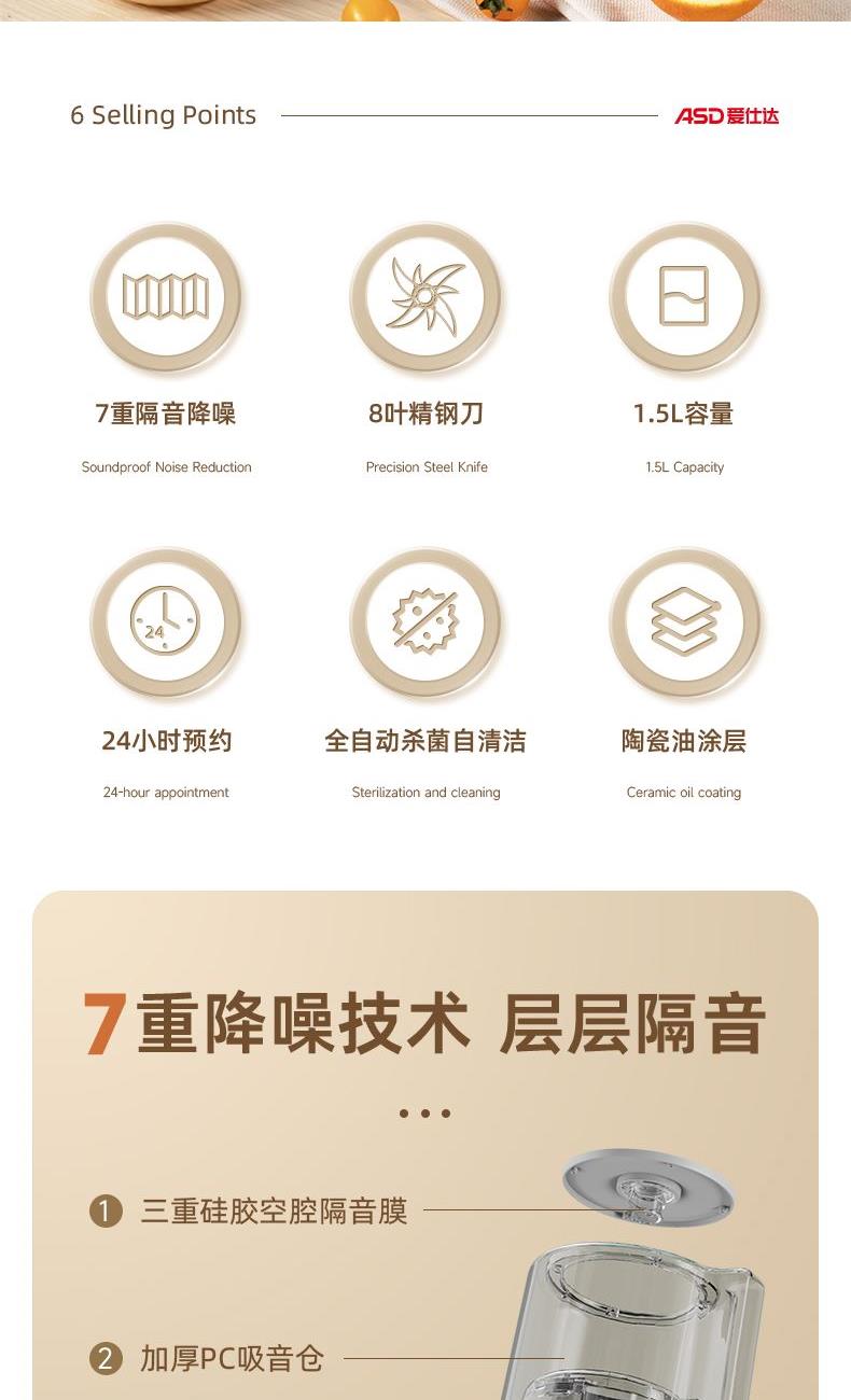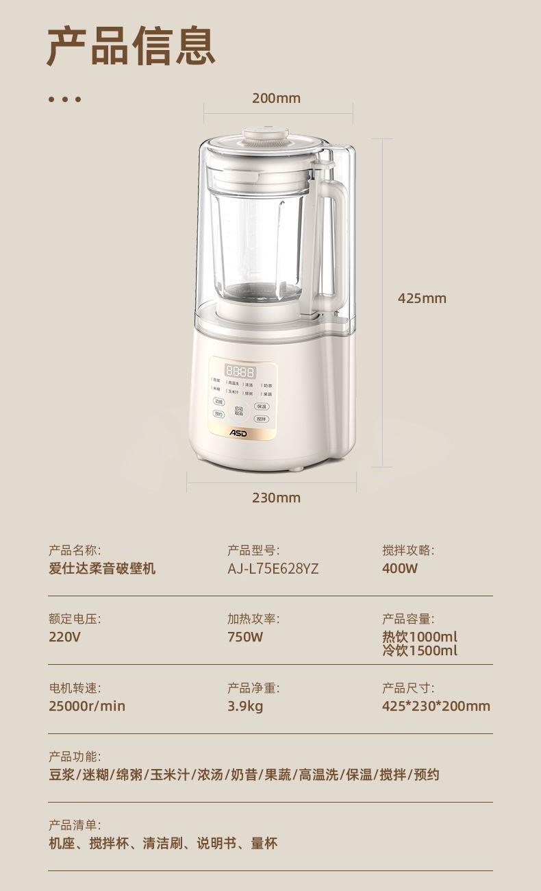 容量 - 1.5L 规格 - 400W/220V 内箱 - 263*244*452 mm 外箱 -580*270*470mm 净重 - 8.8 kg 毛重 - / kg 7重隔音降噪 8叶精钢刀 1.5L容量 24小时预约 自清洁 陶瓷油涂层