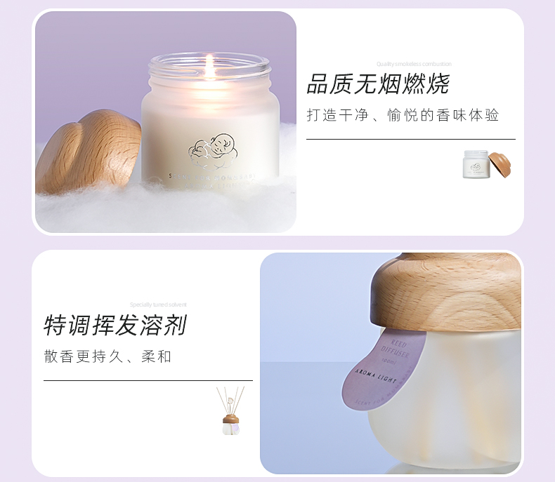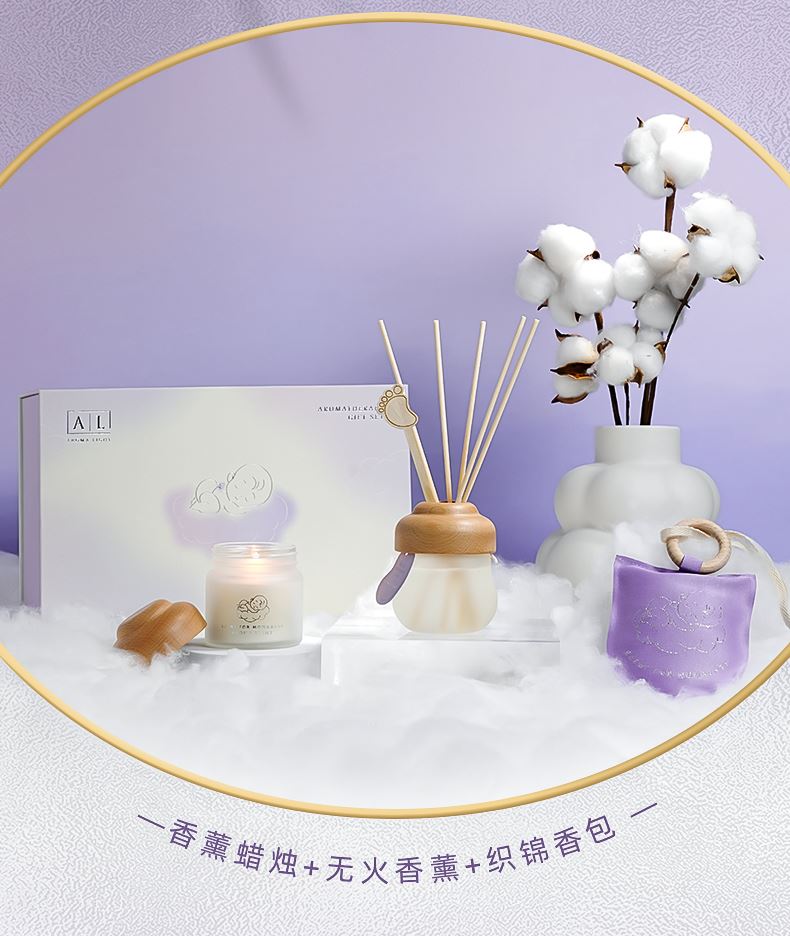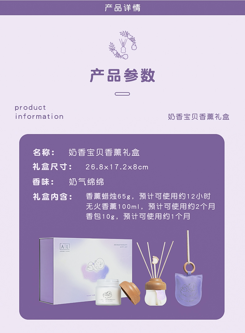 礼盒尺寸 :26.8x17.2x8cm 产品规格: 香薰蜡烛65g(预计燃烧时长18小时) 无火香薰100ml(预计散香时长30天) 香包10g(预计散香时长30天) 香味:奶气绵绵