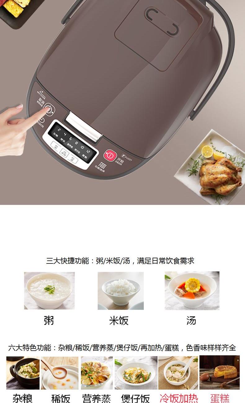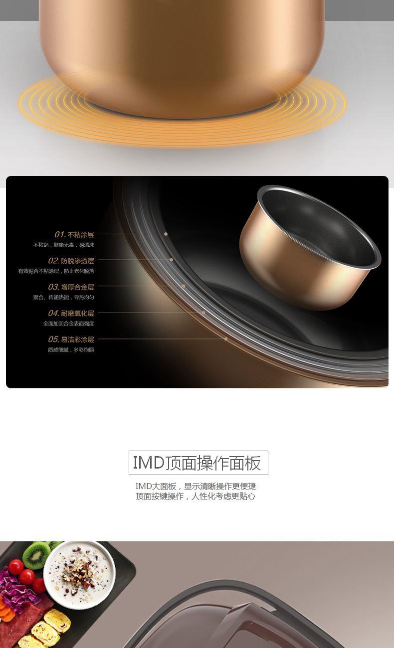 内胆材质 - 铝 规格 - 4L/800W 内箱 - 453*341*265mm 外箱 - 698*468*564mm(吸塑) 净重 - 13.5kg 毛重 - 18.4kg LED多功能灯显示 感温探头智能调温 多种烹饪自由选择 可拆卸盖板