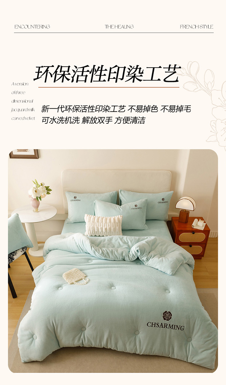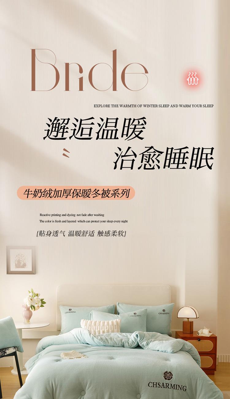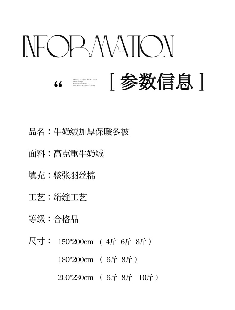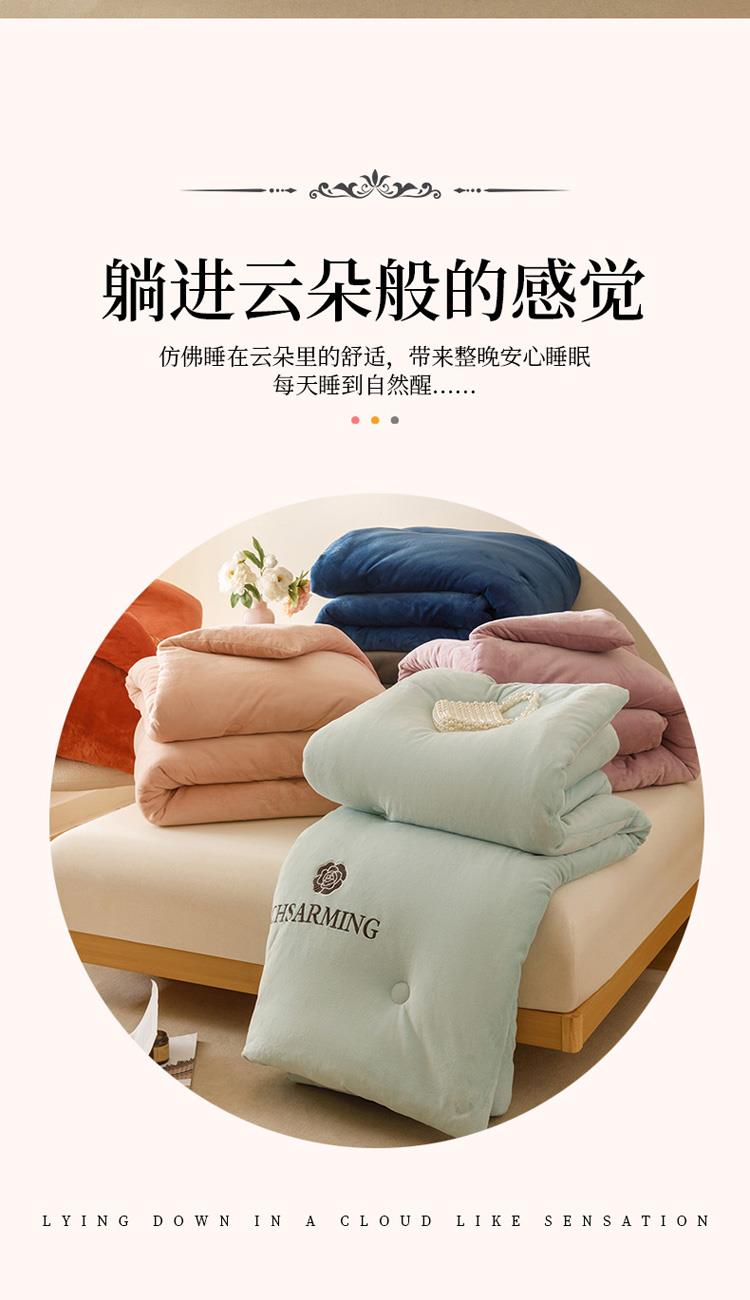 1:牛奶绒加厚保暖冬被系列{贴身透气 温暧舒适 触感柔软) 2:甄选加厚保暖牛奶绒面料 透气吸湿 软糯亲肤贴合身体所触一处皆是温暖 顷刻沦陷 3:采用整张羽丝棉填充 蓬松舒适 透气吸湿 绗缝工艺固定 不易板结 轻盈不压身 4:尺寸:200*230cm*1 重量:3kg 包装:彩盒/礼袋