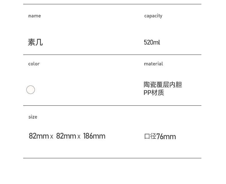 容量:520ml|净重:297g口径:76mm材质:316不锈钢(内胆)304不锈钢(外壳)PP(杯盖)产品尺寸:82mm*82mm*186mm