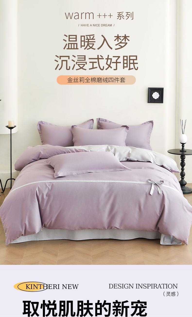 花 型:吉祥如意 面 料:全棉磨毛 规 格:被套200×230cm 床单240×250cm 枕套48×74cm×2 全棉磨绒、告别寒冷、高支高密柔软织绒,采用轻磨毛工艺,在织物表面形成一层短密齐整的绒毛,触感柔软,快速发热的保暖效果,增加了面料的保暖性和舒适性