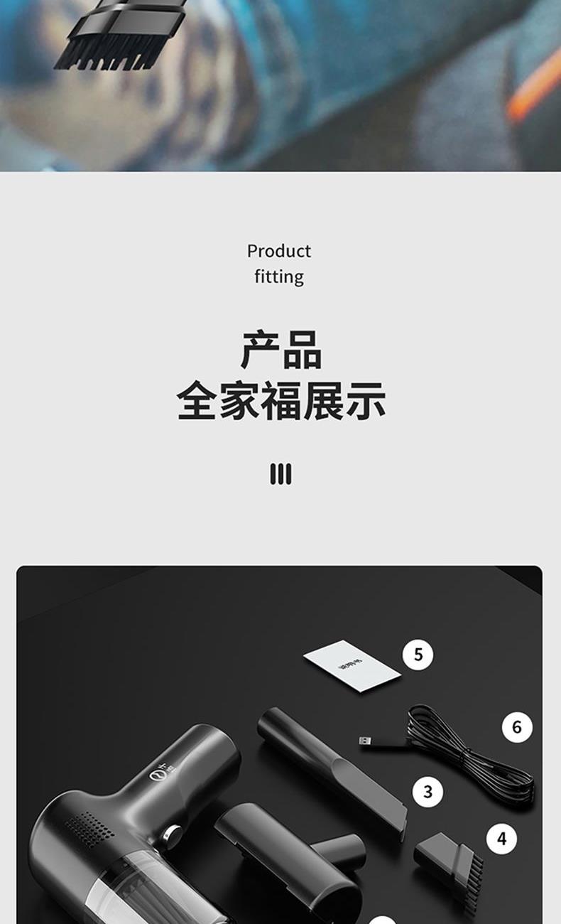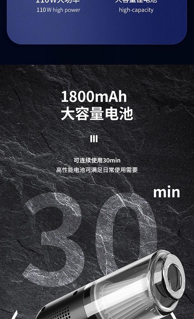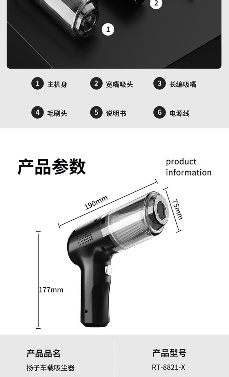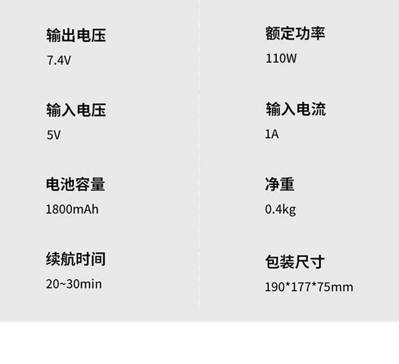 包装尺寸:190*177*75mm 外箱包装:725*395*475mm 包装材料:彩包 输出电压:7.4V~ 输入电压:5V 功 率:120W 电池容量:1800毫安 单台毛重:0.458kg 单台净重:0.4kg 毛发清洁无死角 可水洗过滤网 120W大功率,家车两用