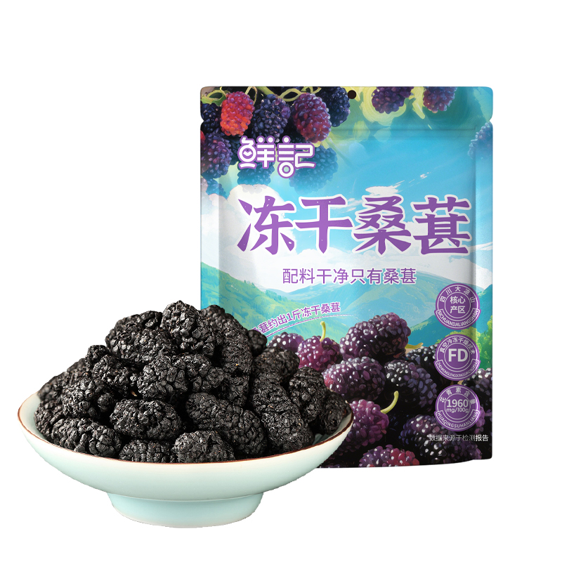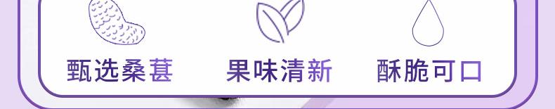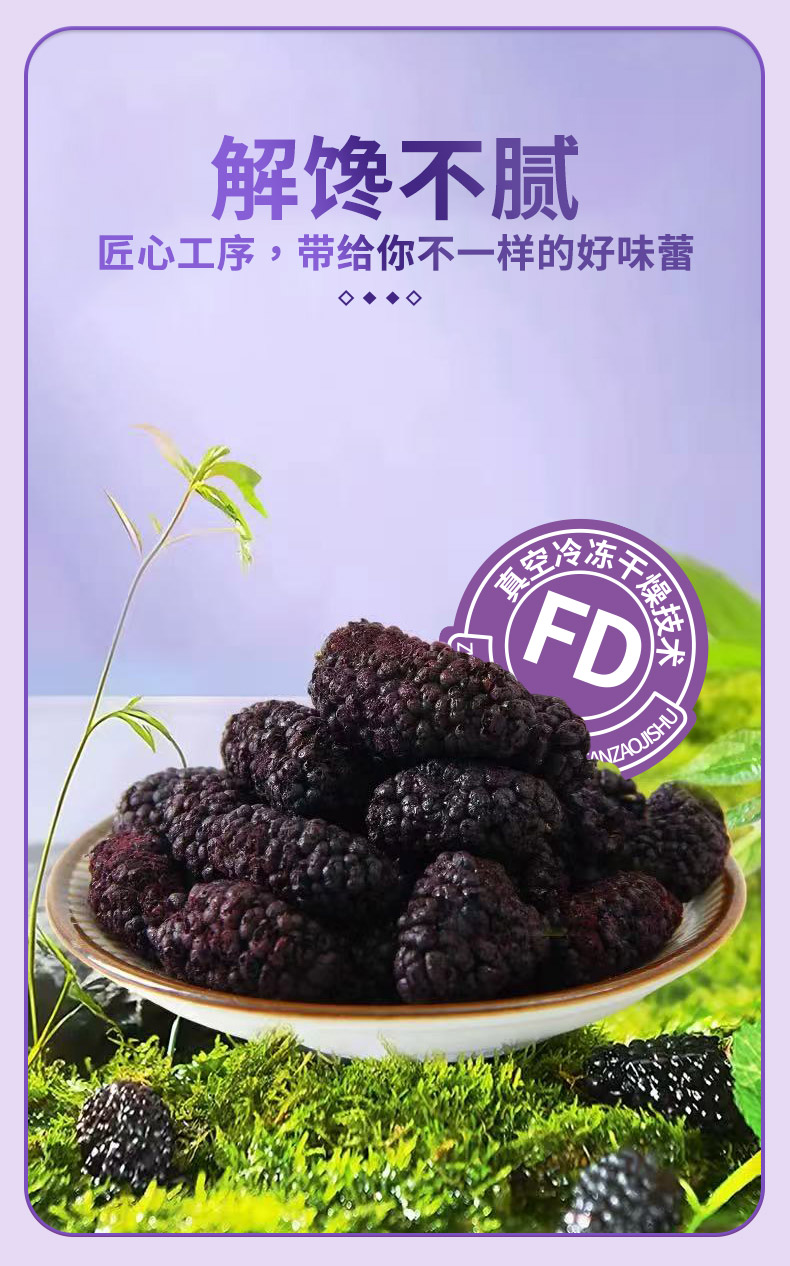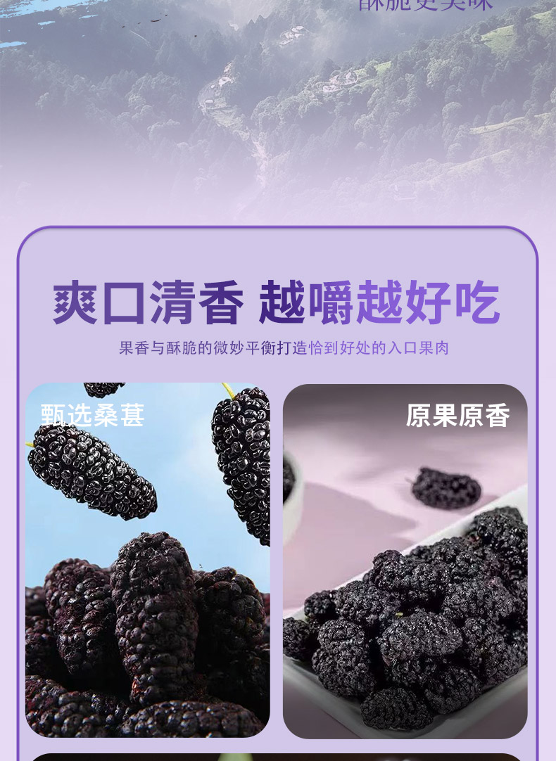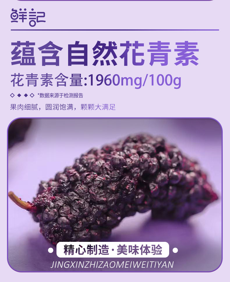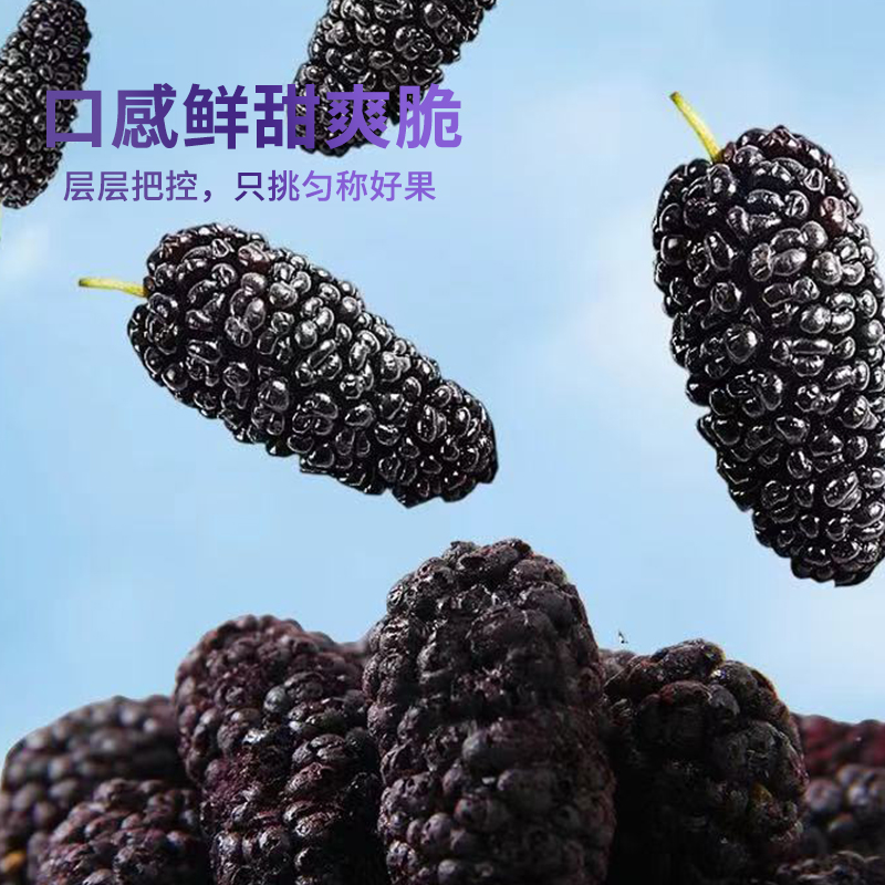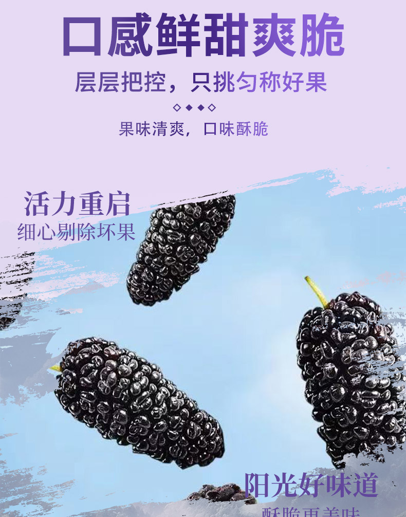 精选桑葚,肉厚饱满; 果肉细腻,圆润饱满; 果味清爽,口味酥脆。