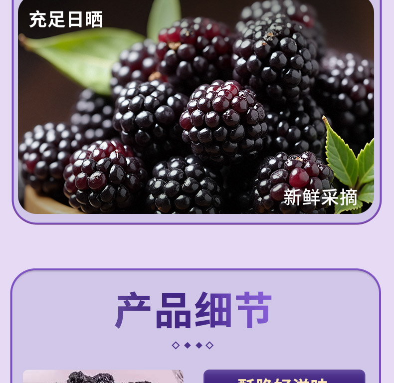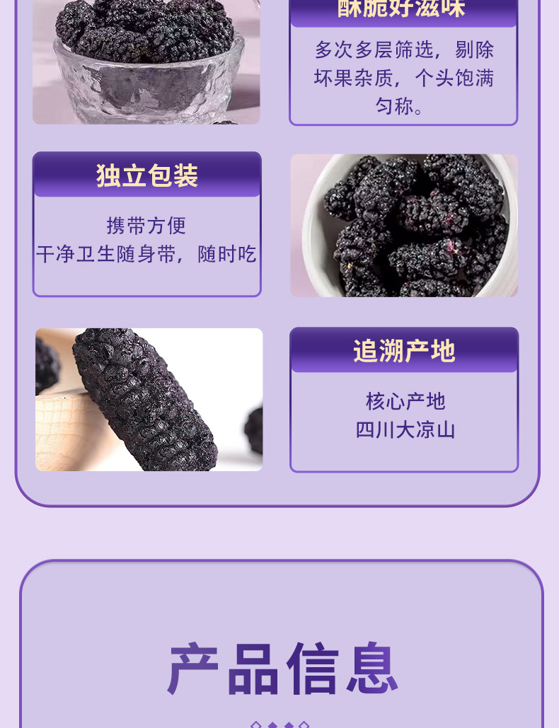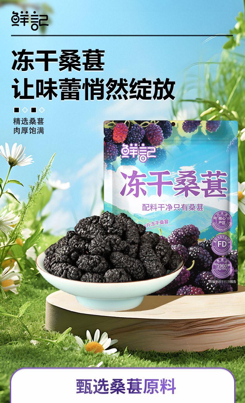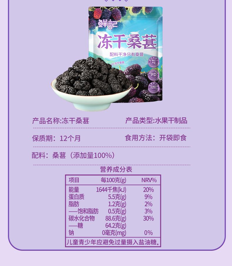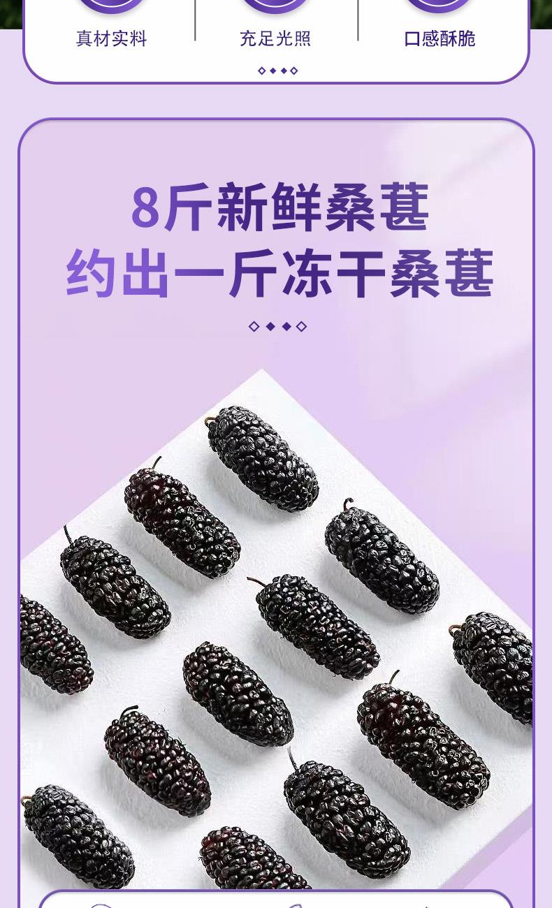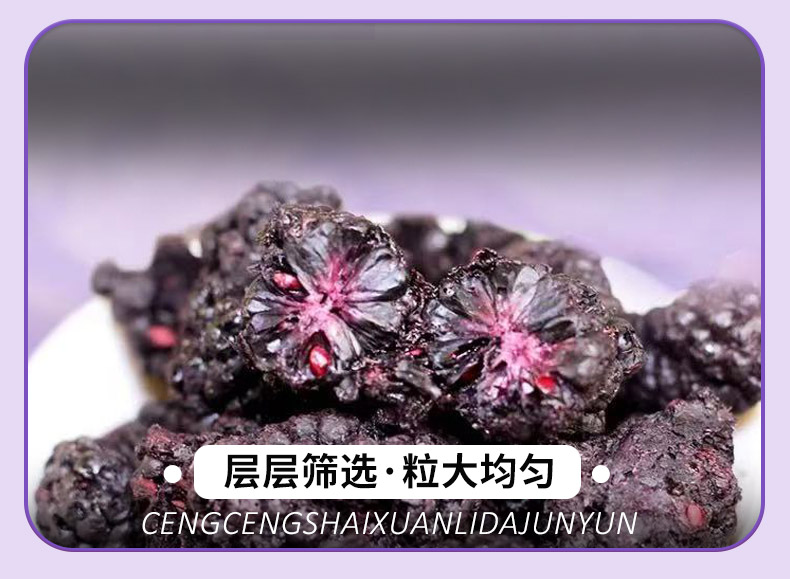 精选桑葚,肉厚饱满; 果肉细腻,圆润饱满; 果味清爽,口味酥脆。