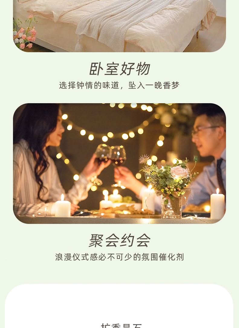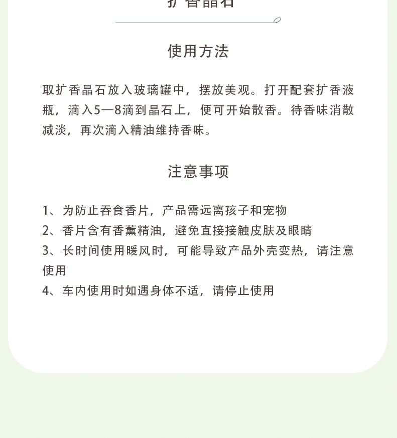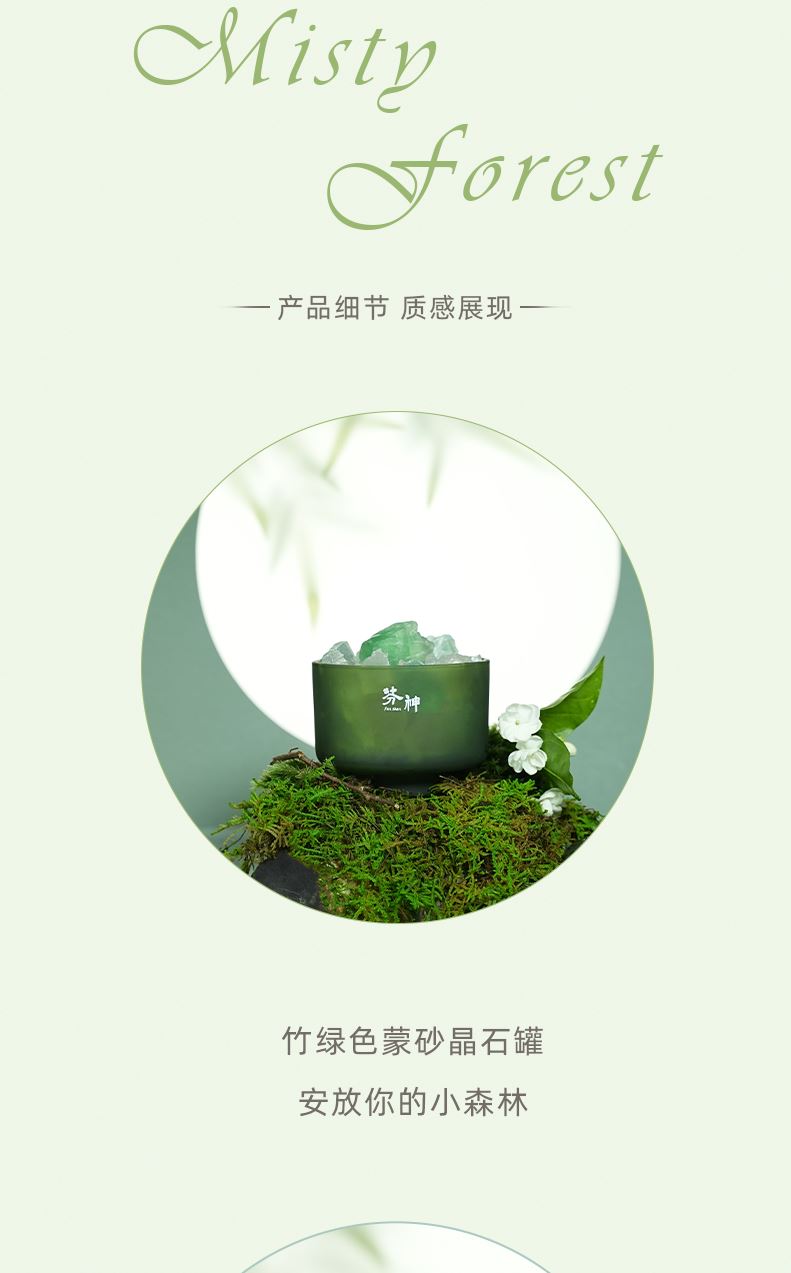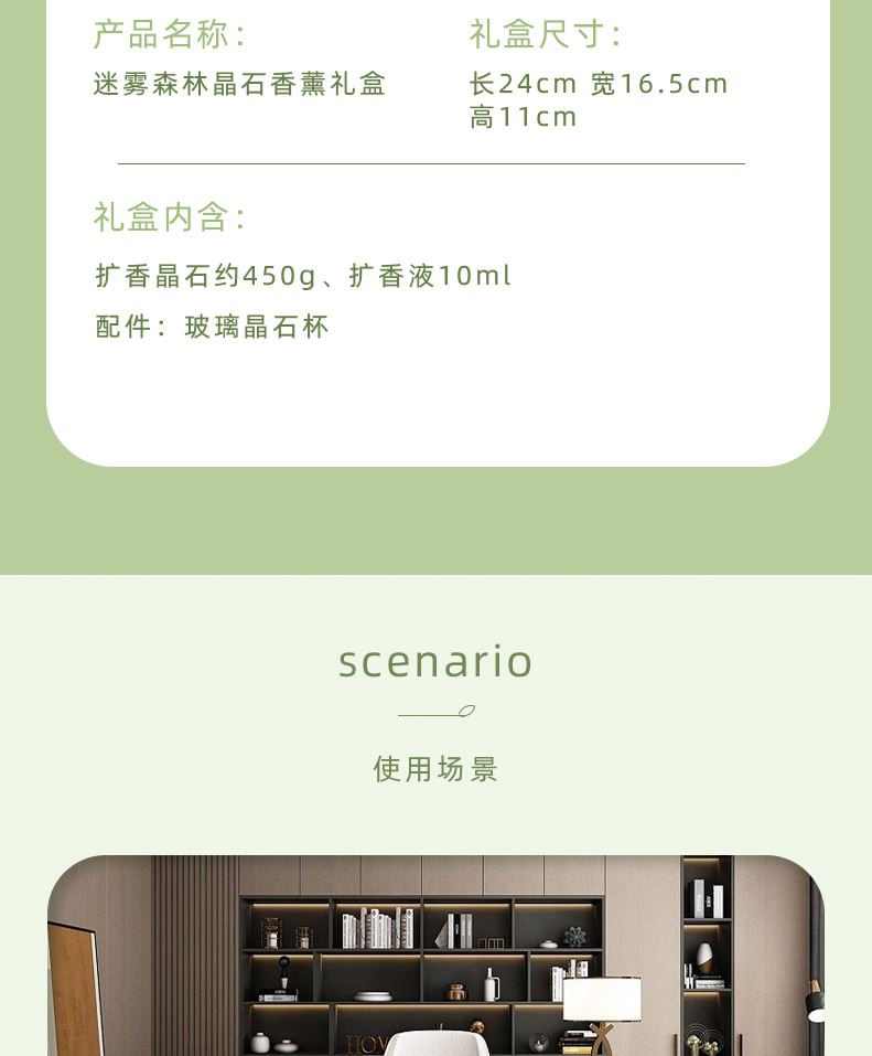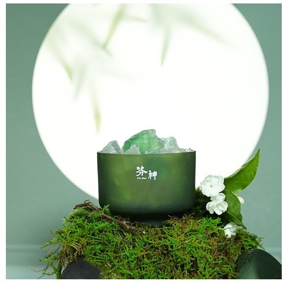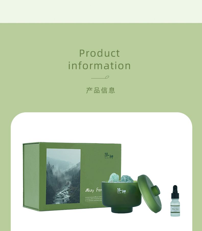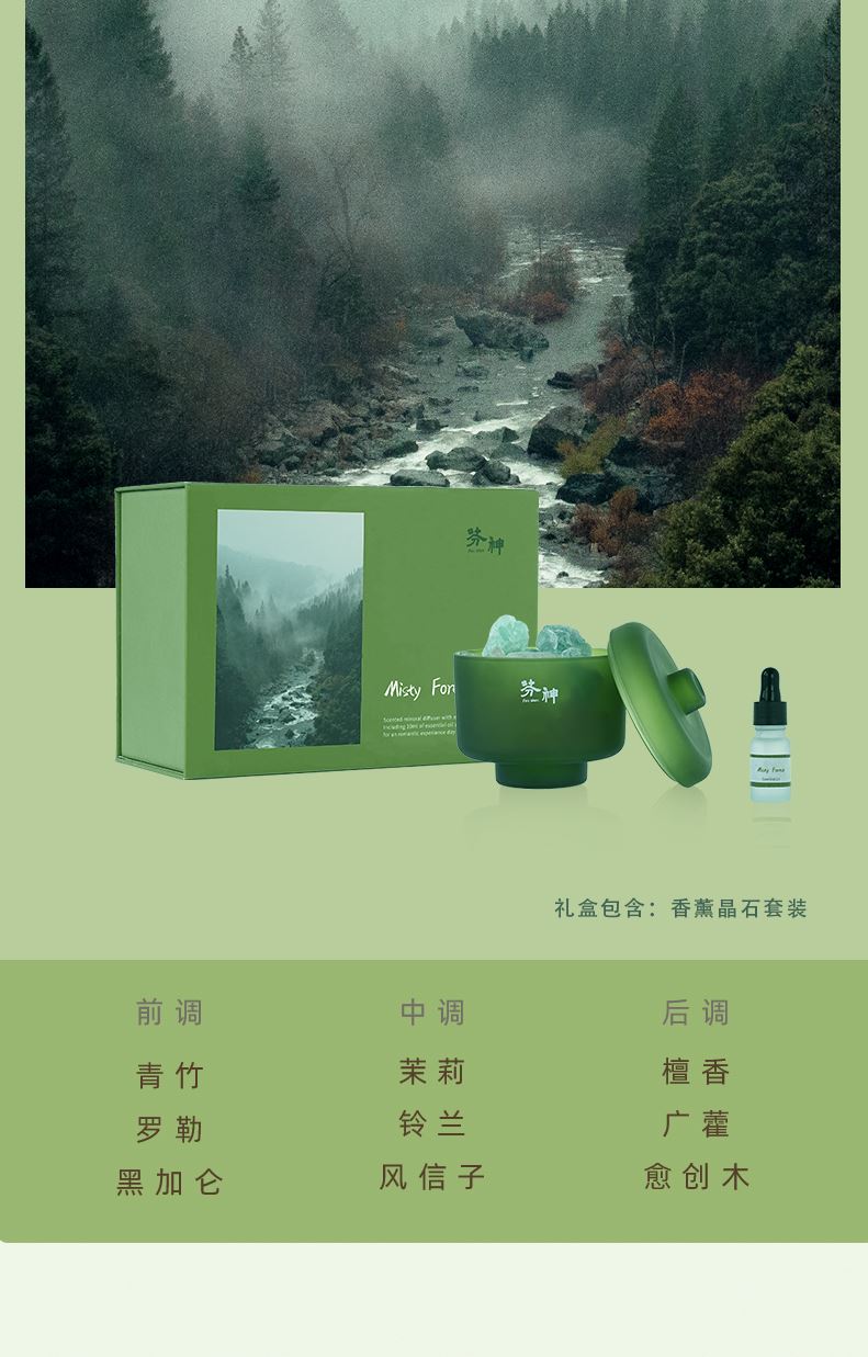 香味:雨后草地 前调:青竹、罗勒、黑加仑 中调:茉莉、铃兰、风信子 后调:檀香、广藿、愈创木 产品规格:扩香晶石约450g、扩香精油10ml、 玻璃容器10x10cm(外径) 礼盒尺寸:24x16.5x11cm