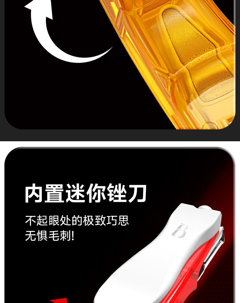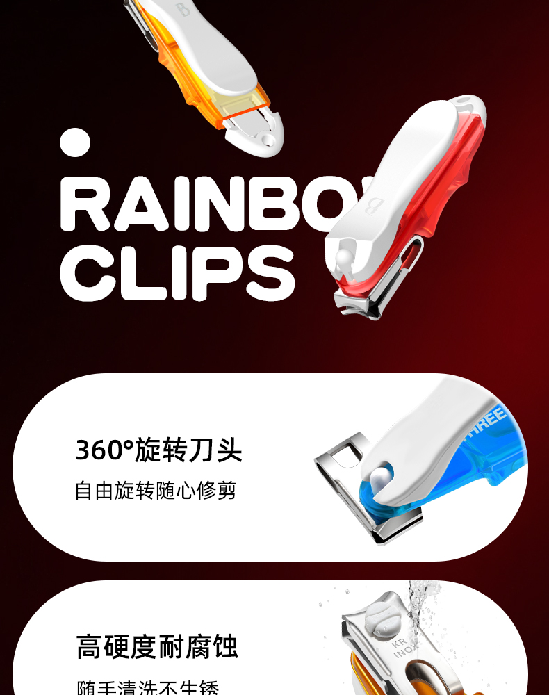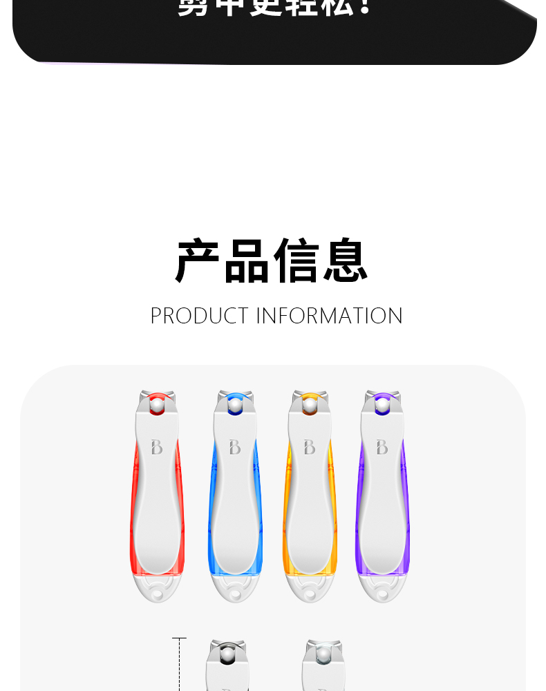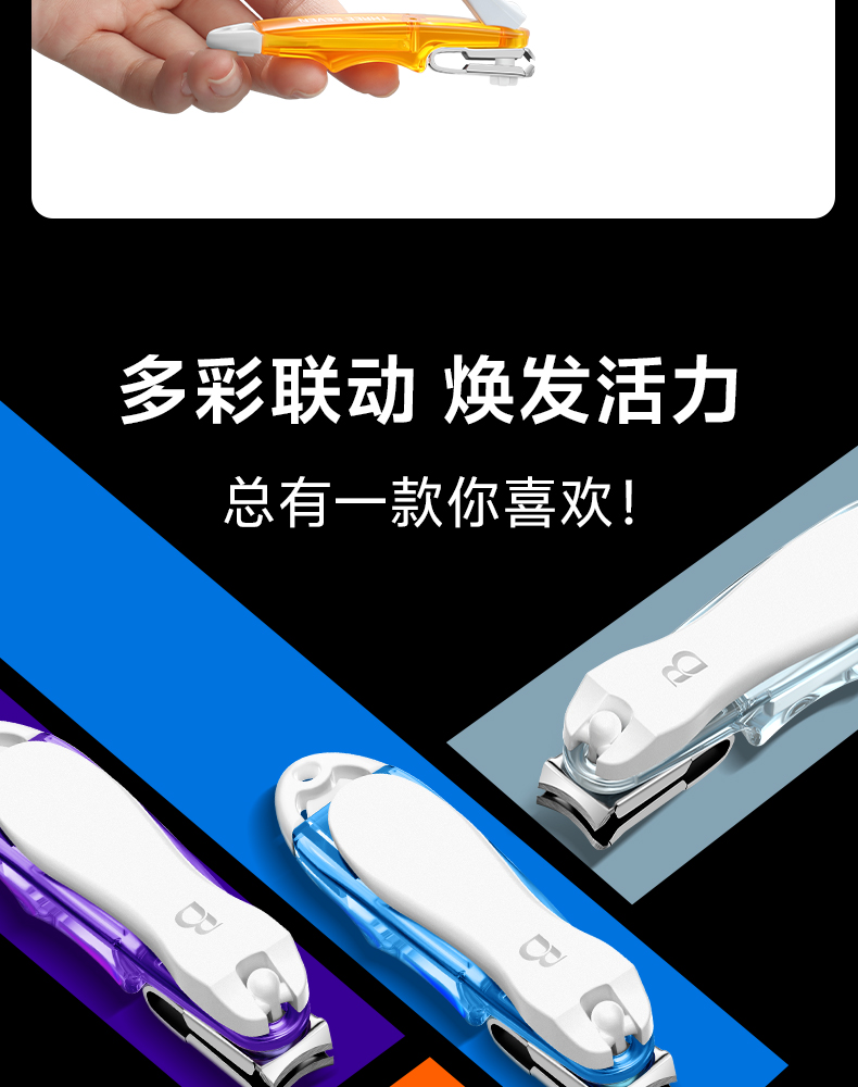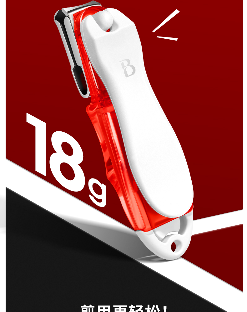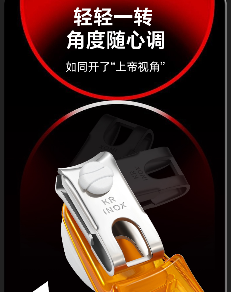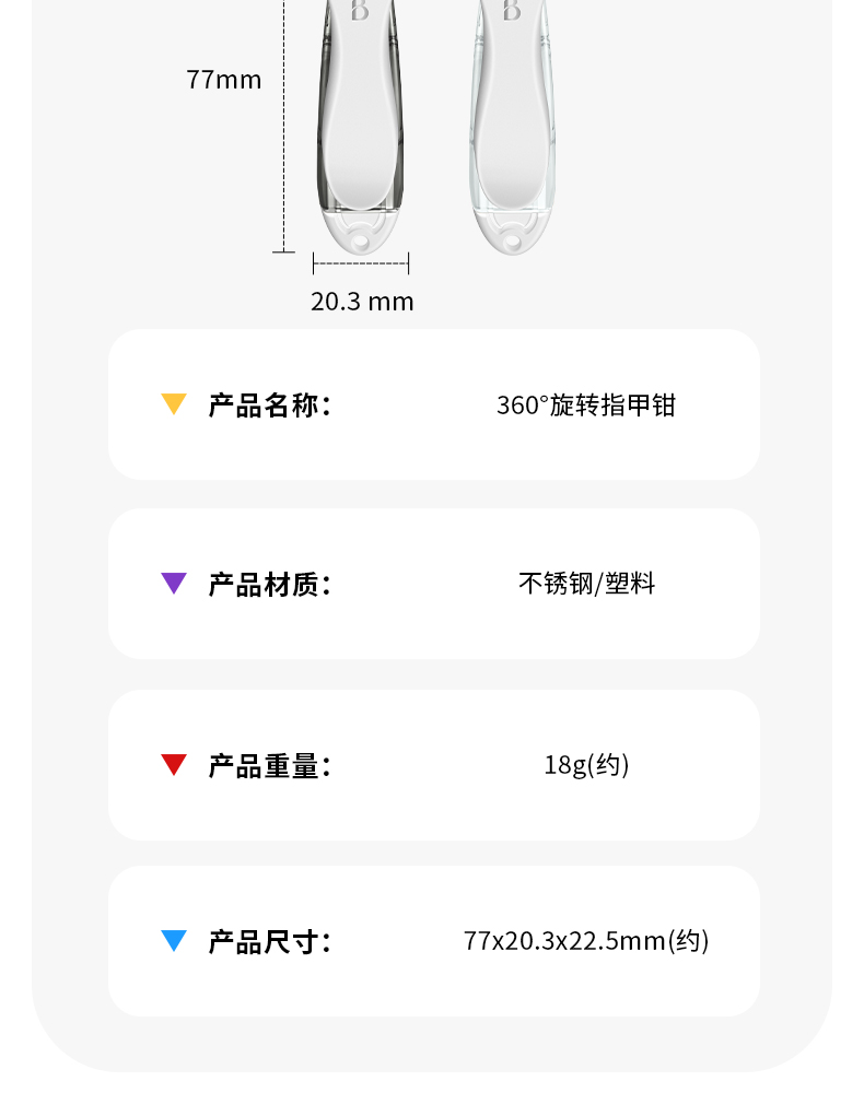 材质:优质不锈钢 规格:76*20*22mm 产品颜色:黑/白/红/黄/蓝/紫 套装内容:单支 产品配件:弧口指甲刀 产品特色:3D弧口刀头,360度可旋转,炫彩指甲刀,透明子弹头包装,小巧一支方便携带收纳