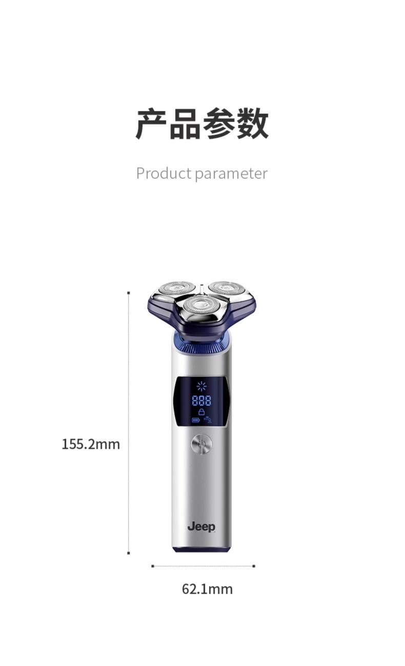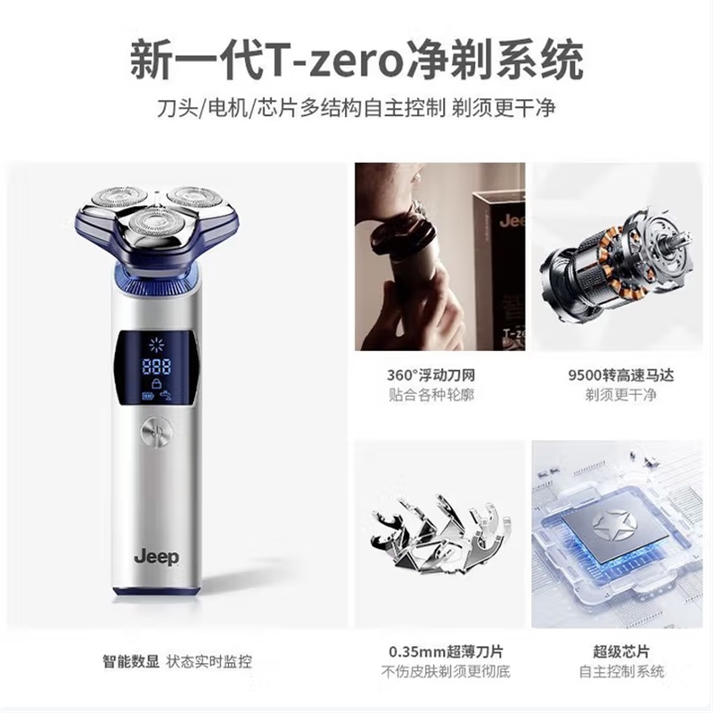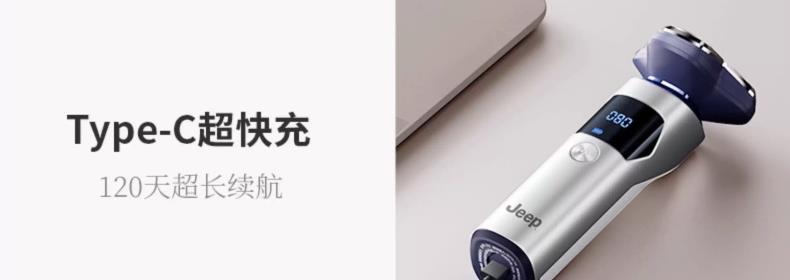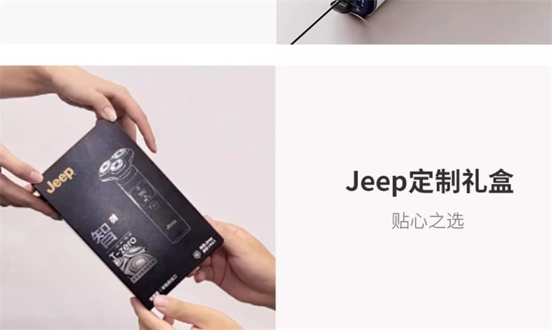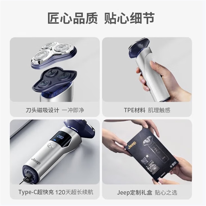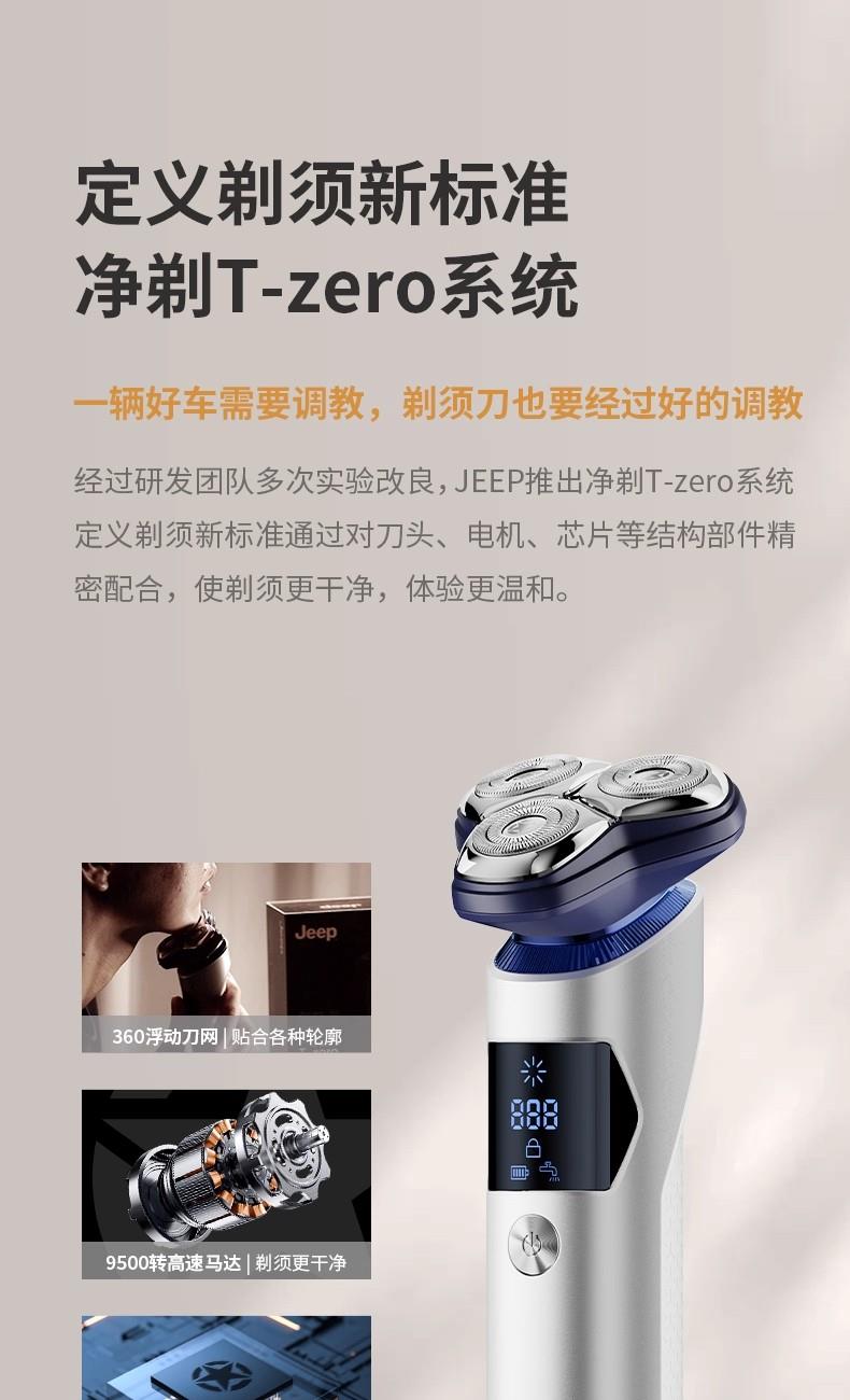 1、TPE环保新材料机身,肌理触感,超强握感 2、JEEP T zero(剃零)创新净剃系统,剃须更智能 3、Type-C充电,2小时快充,150分钟长效续航 4、智能防夹须,稳定利落无拉扯,减少肌肤刺激 5、整机IPX7浸泡级水洗,一冲即净,干湿双剃 6、智能清洗提醒,健康呵护 7、磁吸式刀头,超强磁力吸附设计,更换清洗更轻松 8、9500转高转低音马达,强劲动力,动能十足 9、智能双重保护安全旅行锁,防触控,自保护