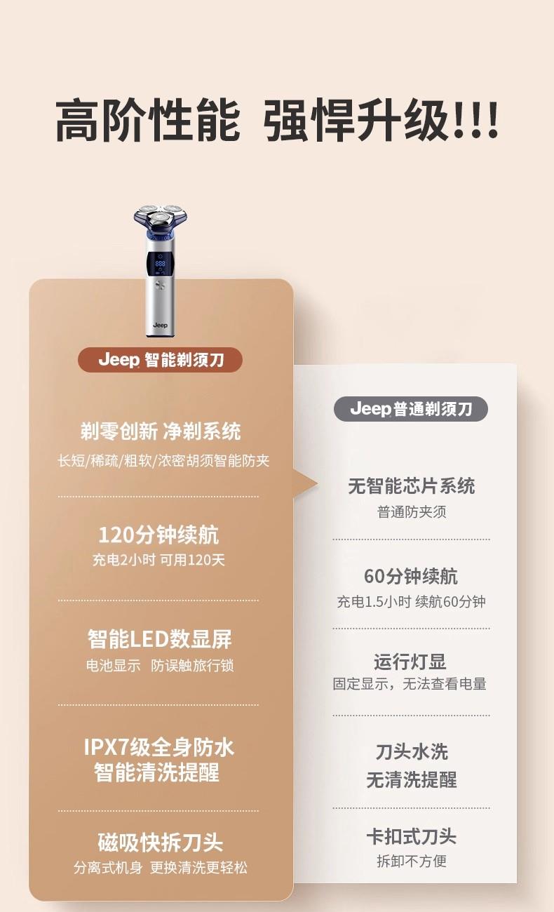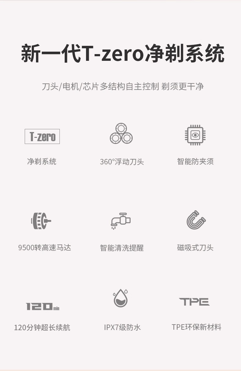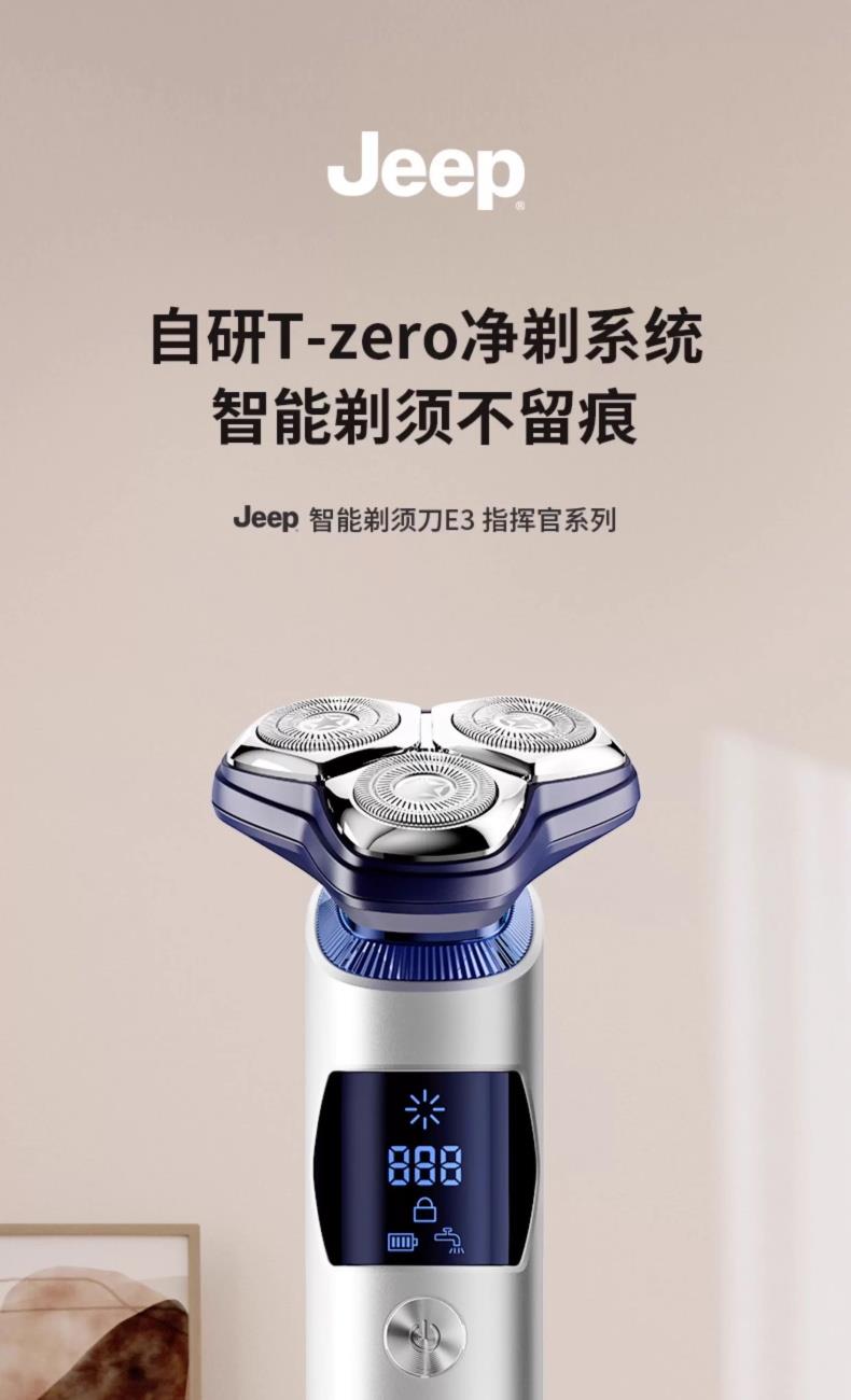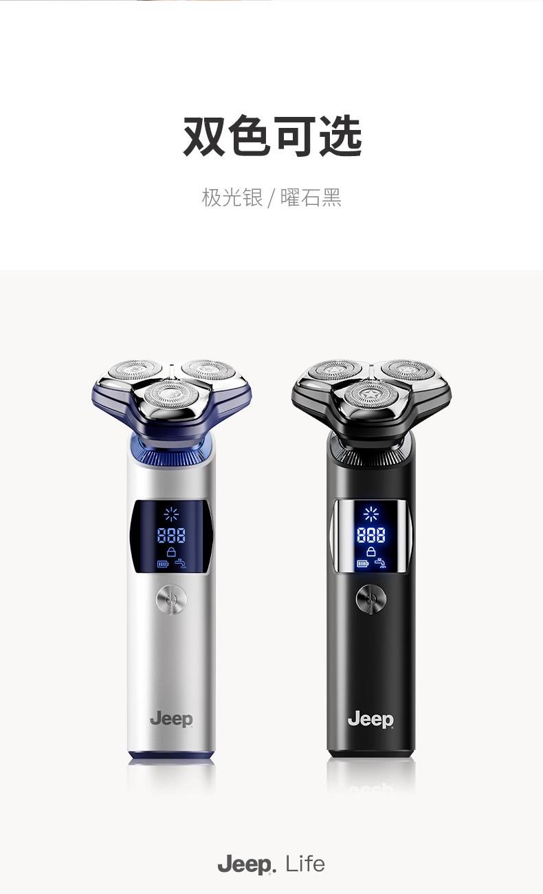 1、TPE环保新材料机身,肌理触感,超强握感 2、JEEP T zero(剃零)创新净剃系统,剃须更智能 3、Type-C充电,2小时快充,150分钟长效续航 4、智能防夹须,稳定利落无拉扯,减少肌肤刺激 5、整机IPX7浸泡级水洗,一冲即净,干湿双剃 6、智能清洗提醒,健康呵护 7、磁吸式刀头,超强磁力吸附设计,更换清洗更轻松 8、9500转高转低音马达,强劲动力,动能十足 9、智能双重保护安全旅行锁,防触控,自保护