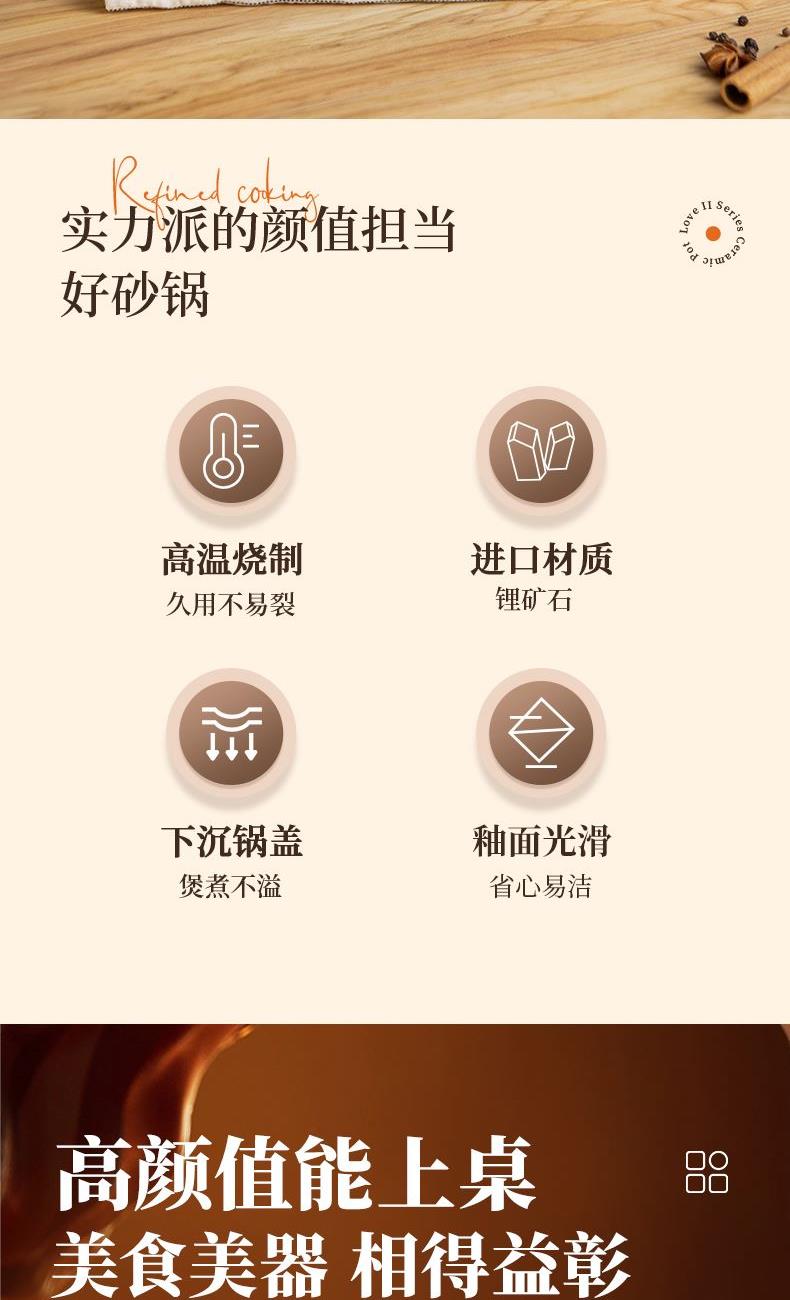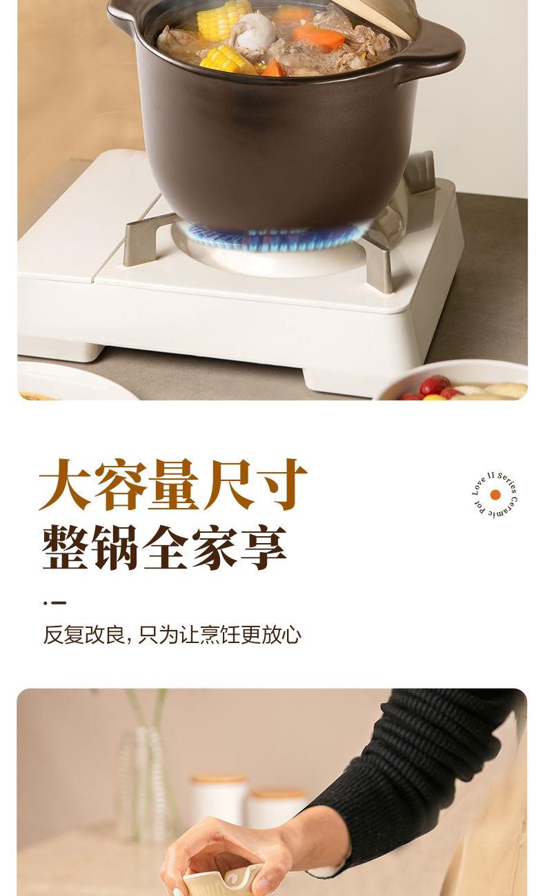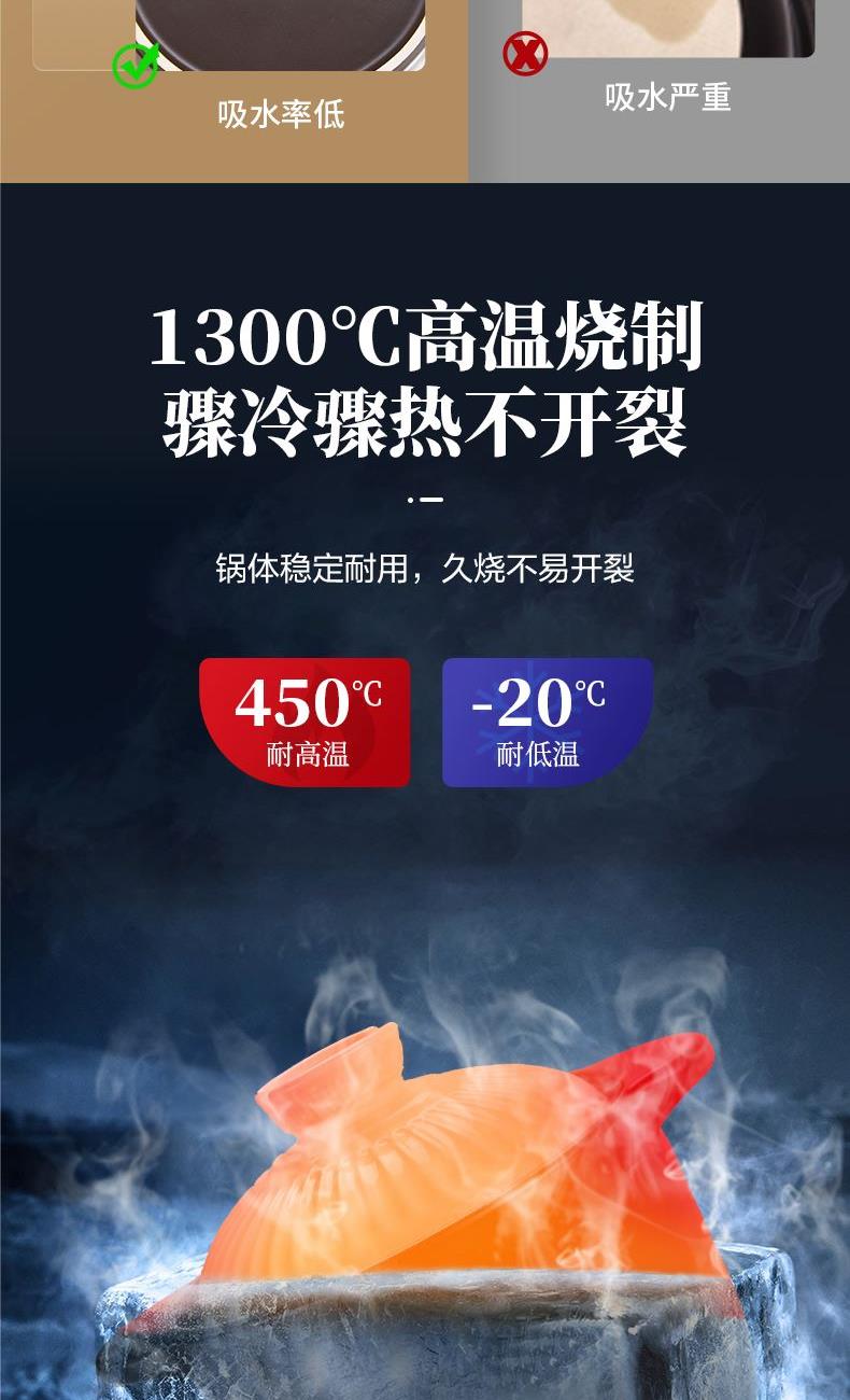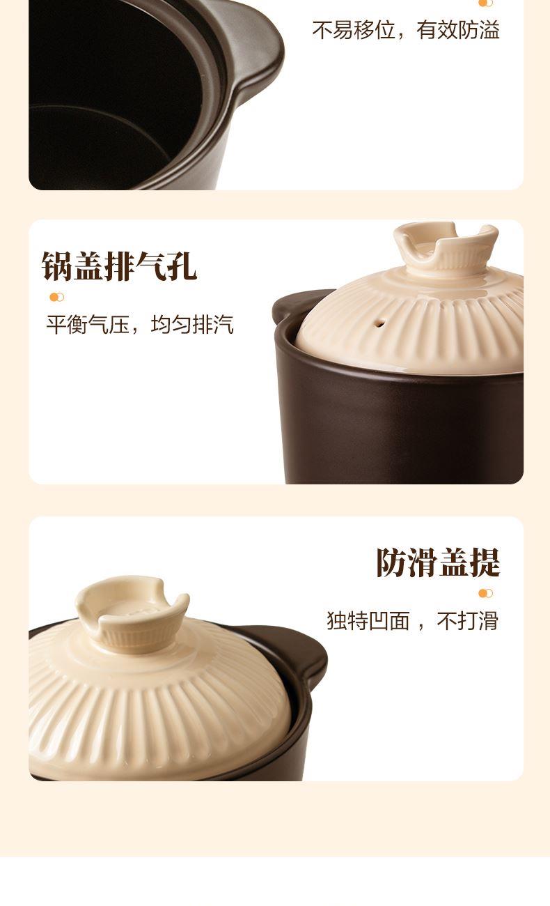 材质 – 耐热陶土 规格:3.8L 内箱 – 320*320*26 mm 外箱 - / mm 净重 – 16.8 kg 毛重 – 18.5 kg 1、进口锂基矿物原料,可承受450-20°的温差,耐酸碱性好,健康安全;2、下沉式锅盖,紧贴煲身防外溢3、、一体式防滑手柄,使用更安全;4、一煲多用熬炖煲焖