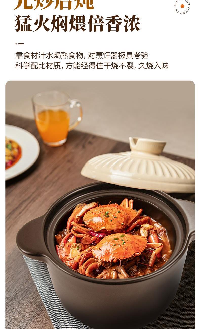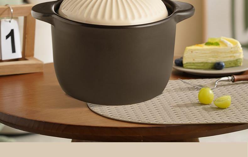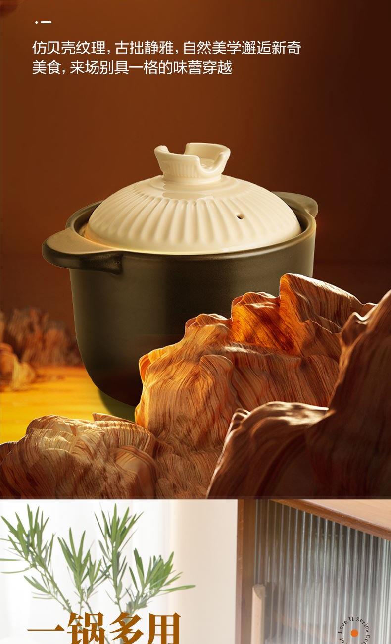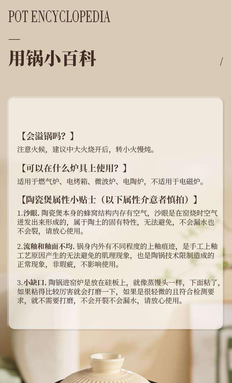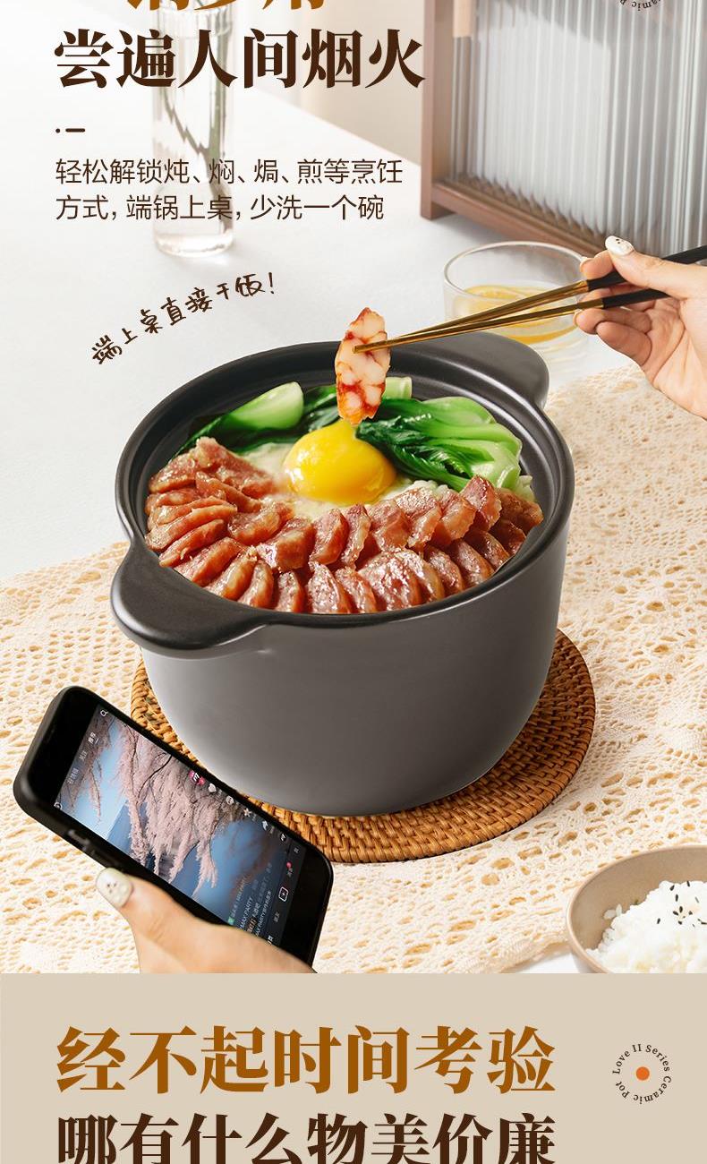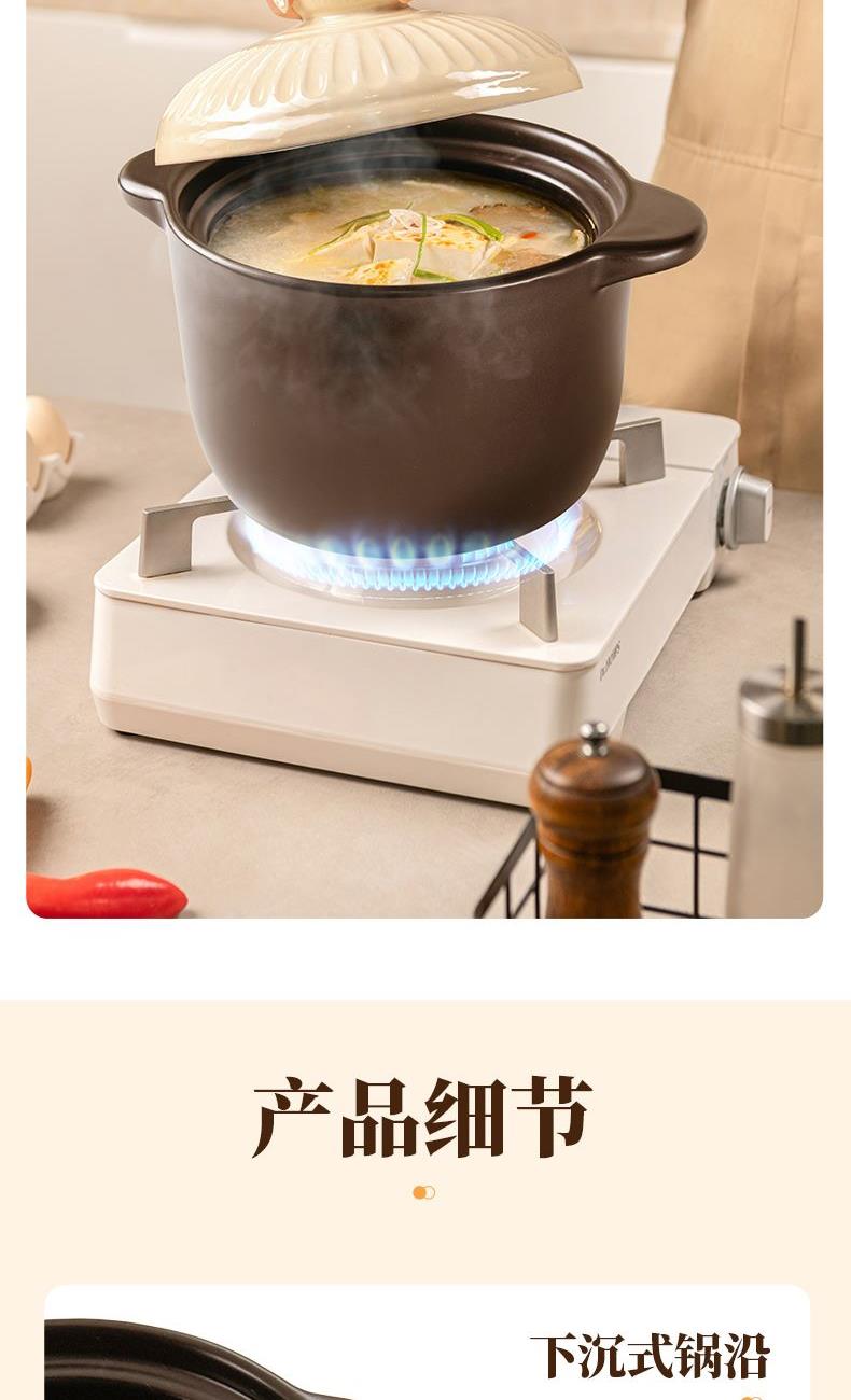 材质 – 耐热陶土 规格:3.8L 内箱 – 320*320*26 mm 外箱 - / mm 净重 – 16.8 kg 毛重 – 18.5 kg 1、进口锂基矿物原料,可承受450-20°的温差,耐酸碱性好,健康安全;2、下沉式锅盖,紧贴煲身防外溢3、、一体式防滑手柄,使用更安全;4、一煲多用熬炖煲焖