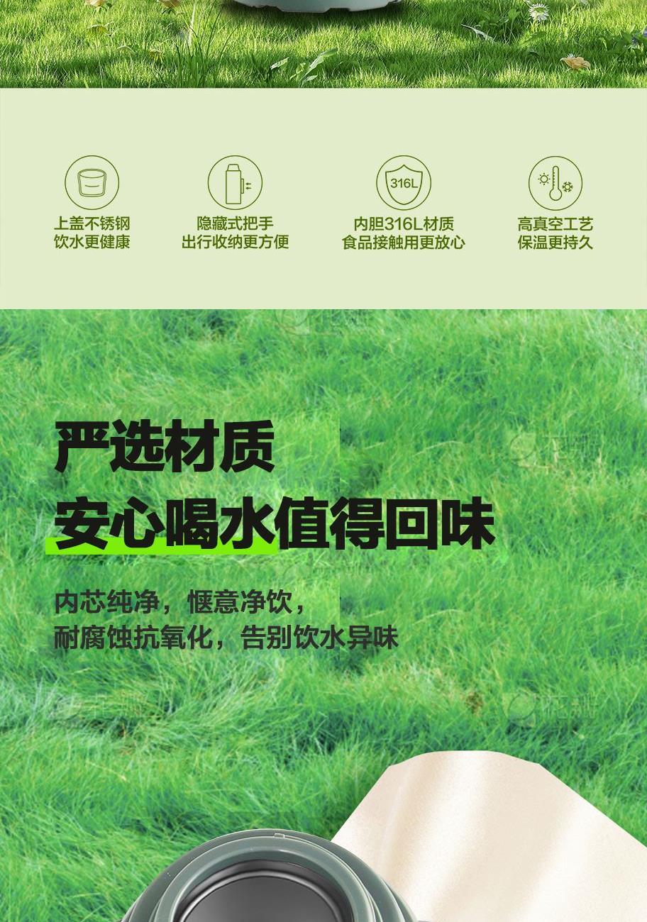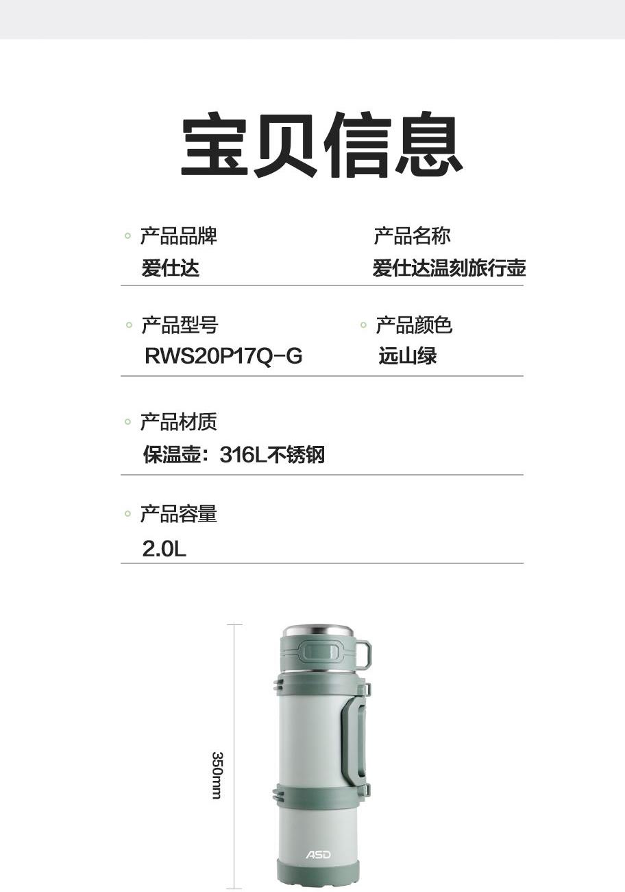 材质 –内胆316L 规格 – 2.0L 内箱 - 135x123x367mm 外箱 - 600x468x313 mm 净重 – 12.3kg 毛重 – 14.1kg 条码 - 6921880731935