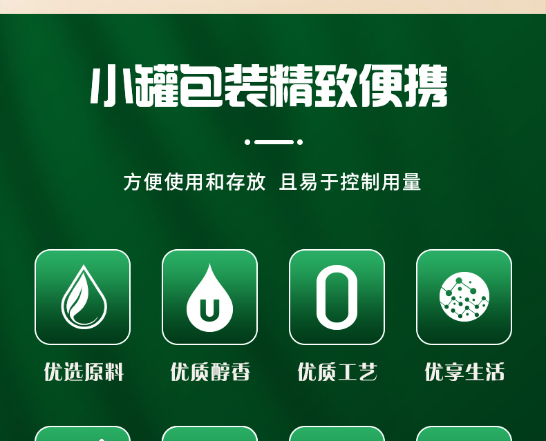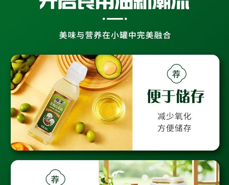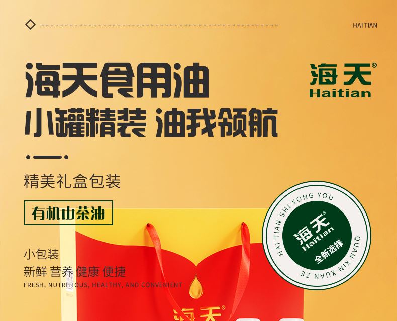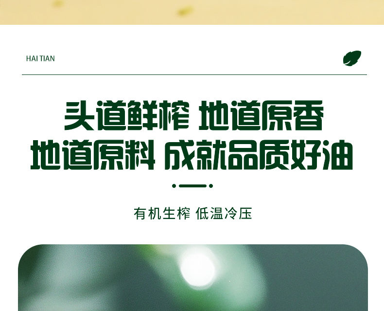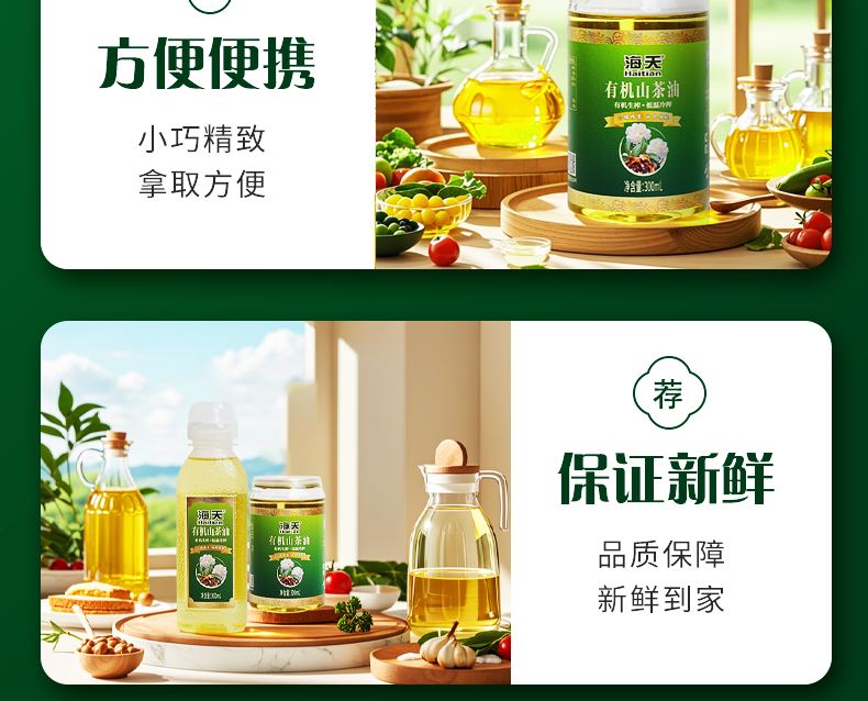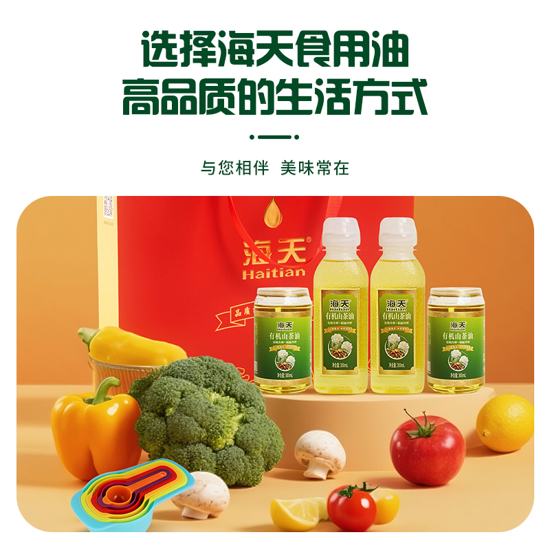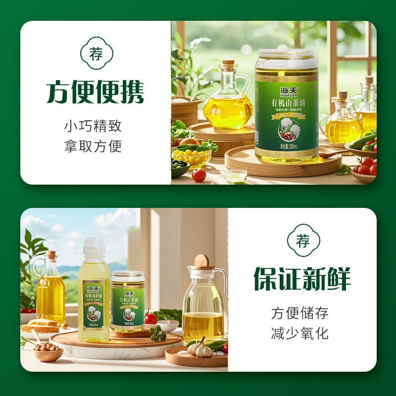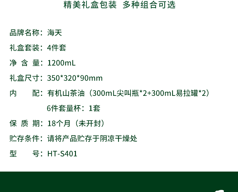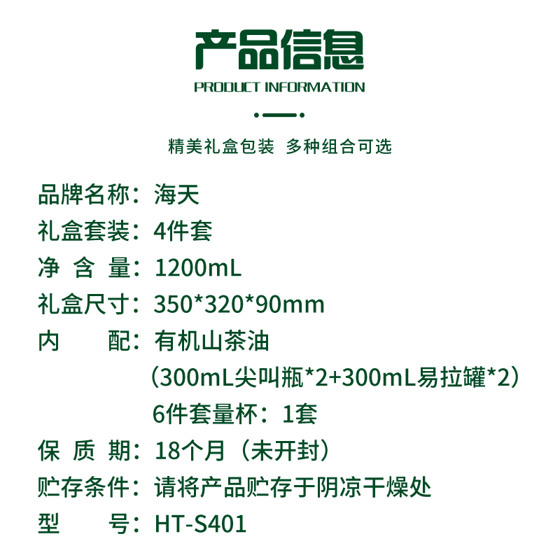 净含量:1.2L 内配:有机山茶油 (300mL尖叫瓶*2+300mL易拉罐*2) 6件套量杯1套 包装尺寸:350*320*90mm 保质期:18个月(未开封) 有机生榨 低温冷压 头道鲜榨 地道原香 国jia有机认证 全产业链有机 80%左右高油酸 轻脂肪 含维生素E 角鲨烯 茶多酚等多种健康微量元素 亚油酸和亚麻酸接近4:1黄金比例 215°高烟点 烹饪少油烟 生活更健康