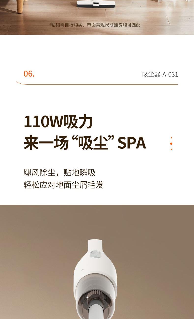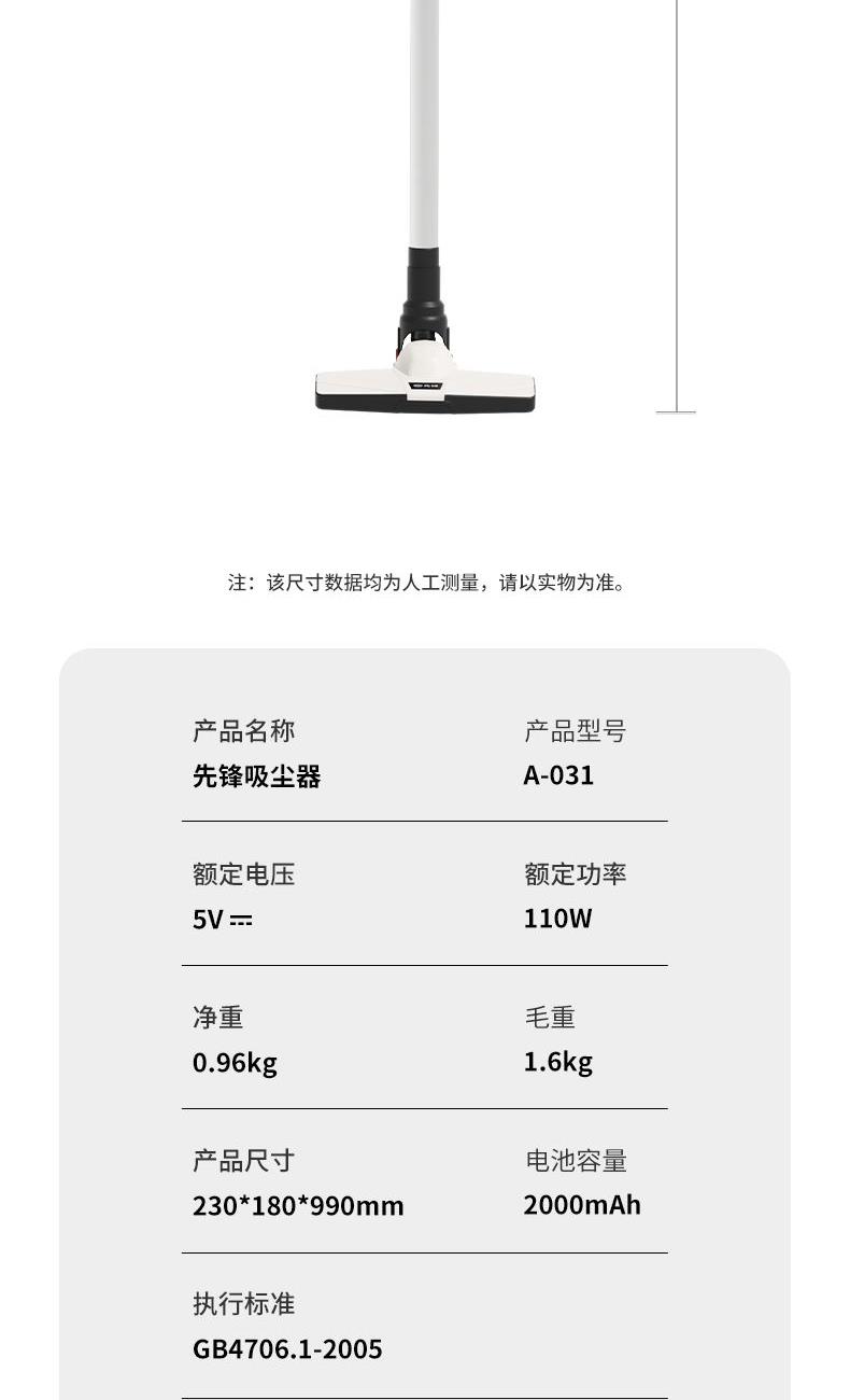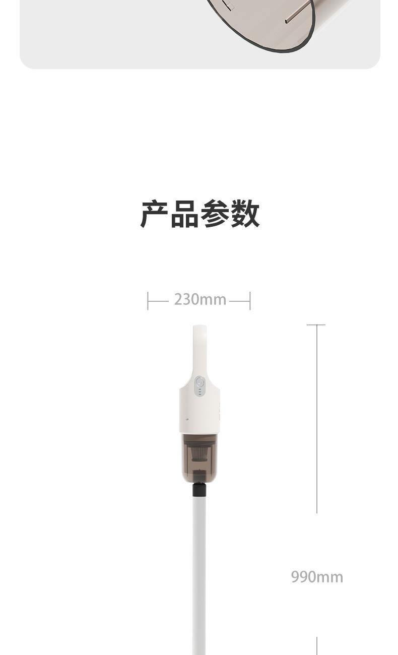 产品尺寸:89*89*350mm 彩包尺寸:621*99*225mm 大外箱尺寸:635*465*520mm 单台净重:0.96kg 单台毛重:1.60Kg 充电输入:5V--2A 额定功率:110W 包装材料:彩盒+大外箱 产品条码:6977197070953 尘杯、滤芯可拆洗,更洁净,重复使用经济实惠 | 一键启动运转,操作简单 | 方便拿握手,轻量机身好上手 | 收纳方便不占地 |多种刷头随意更换,立式手持随意切换。
