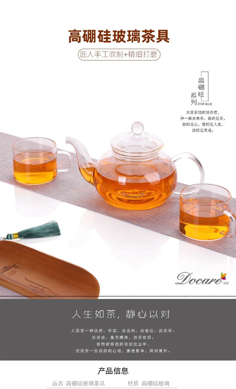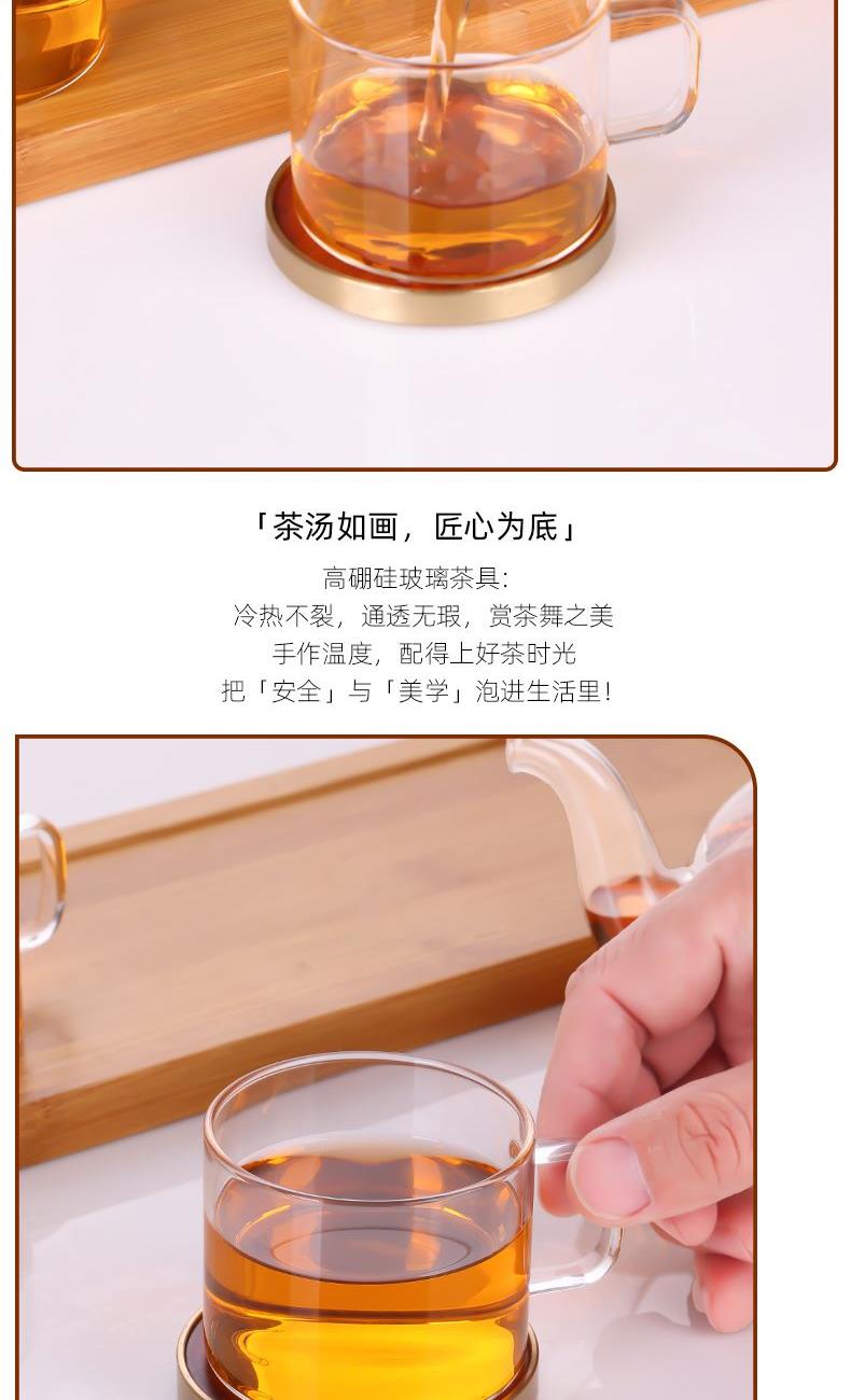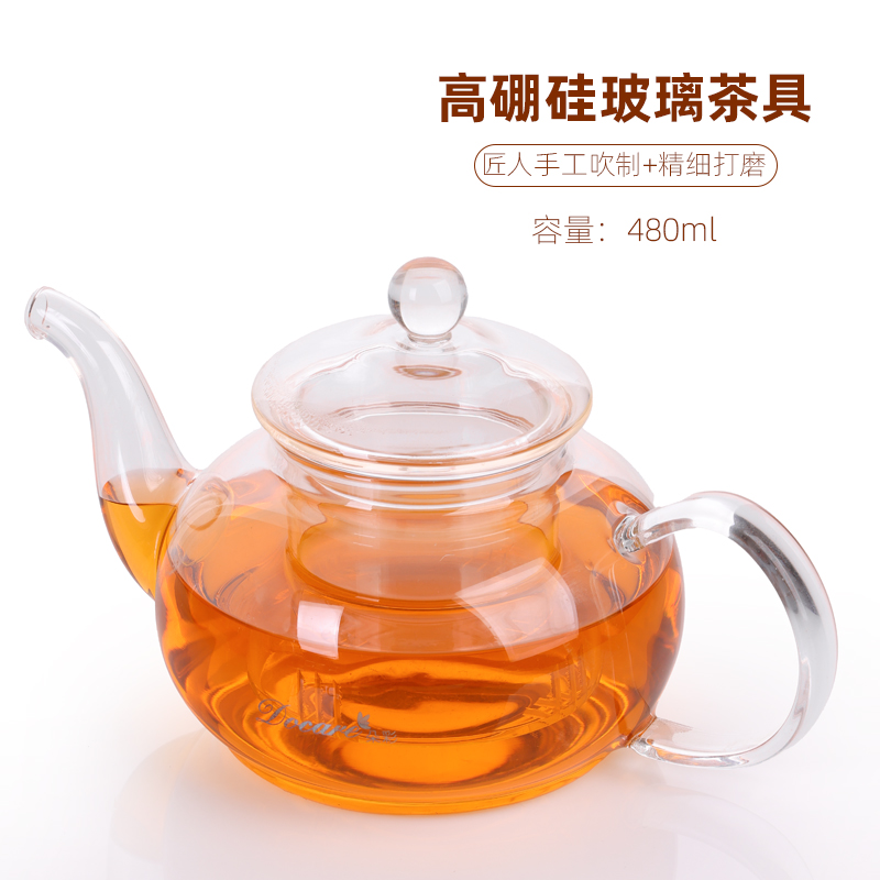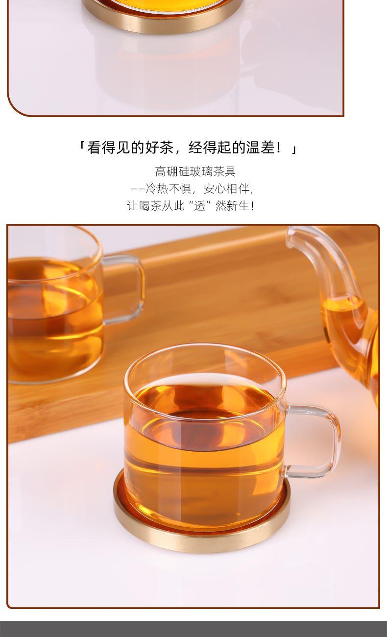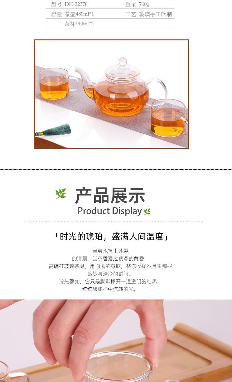 材质:高硼硅玻璃 容量:茶壶480ML,茶杯140ML 配置:茶壶1个,茶杯2个。 彩盒尺寸:285*131*225mm 单套重量:0.71Kg 外箱尺寸:580*395*470mm 高硼硅茶具耐高低温