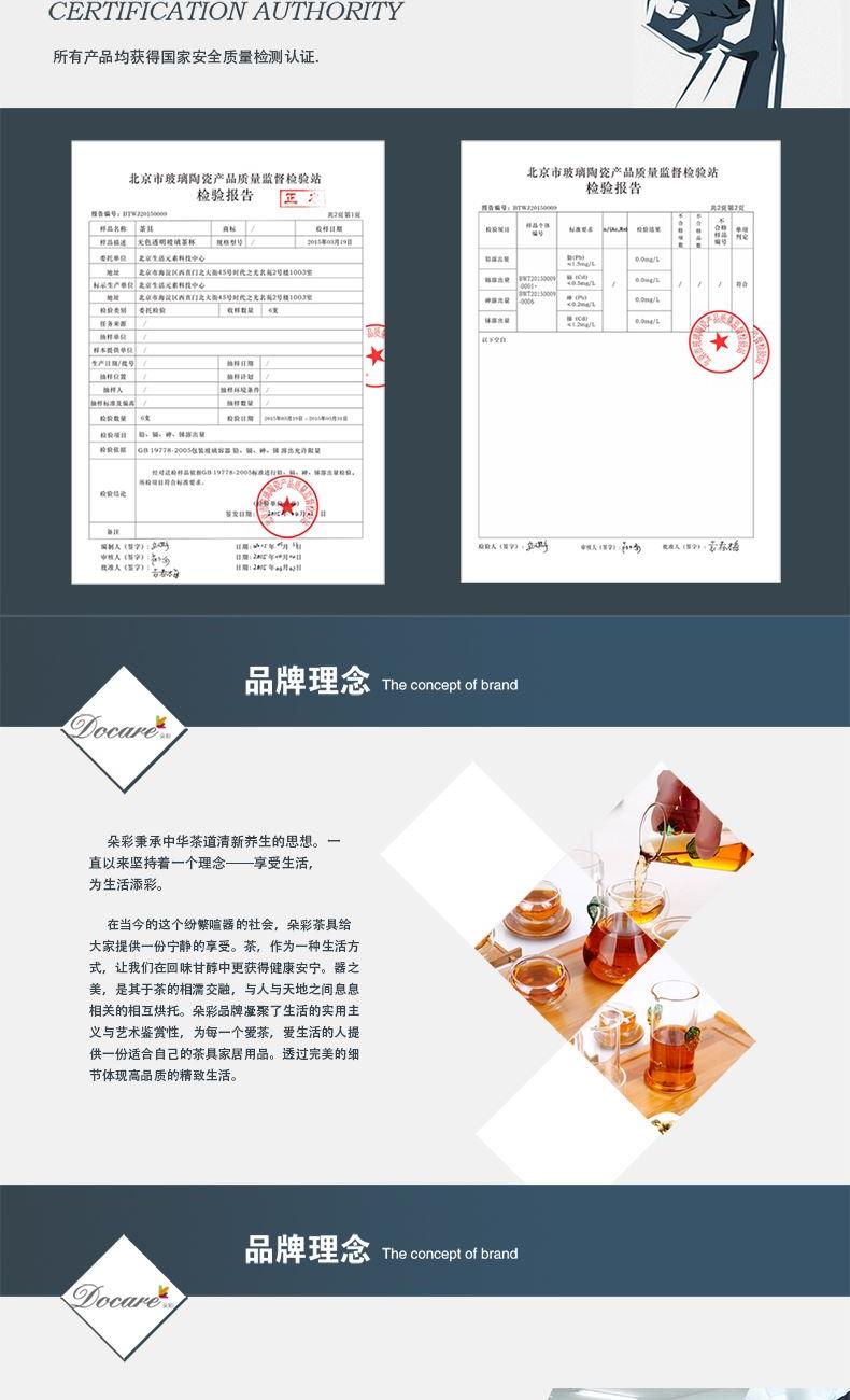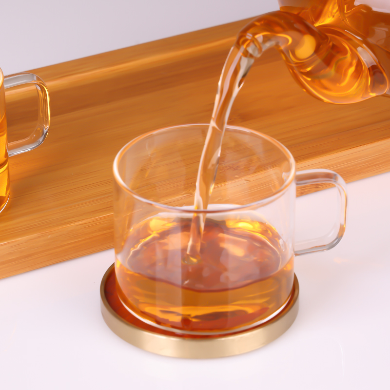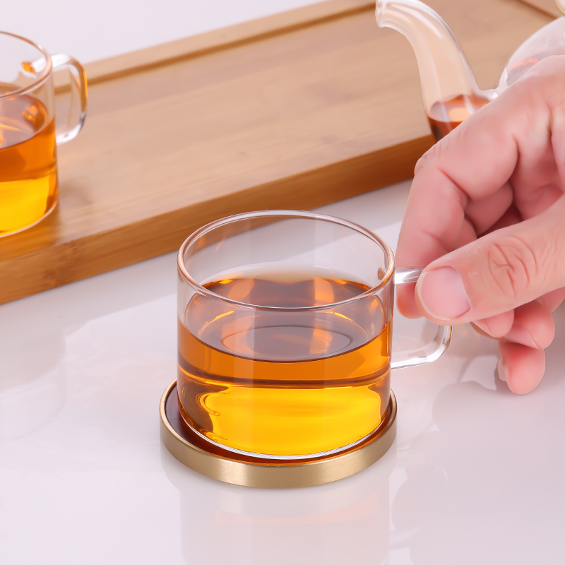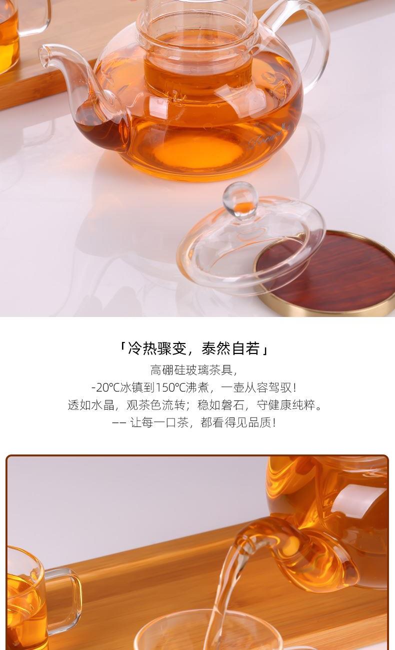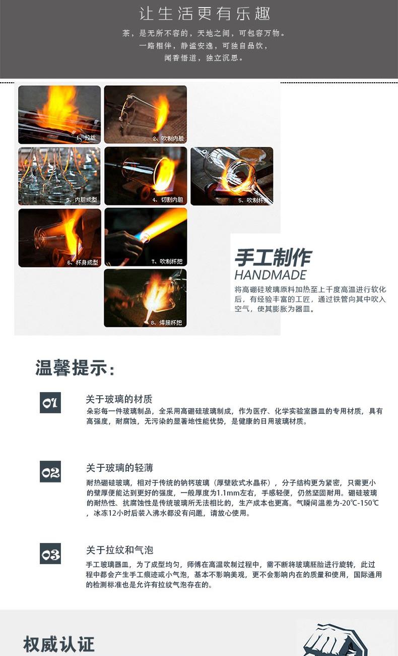 材质:高硼硅玻璃 容量:茶壶480ML,茶杯140ML 配置:茶壶1个,茶杯2个。 彩盒尺寸:285*131*225mm 单套重量:0.71Kg 外箱尺寸:580*395*470mm 高硼硅茶具耐高低温