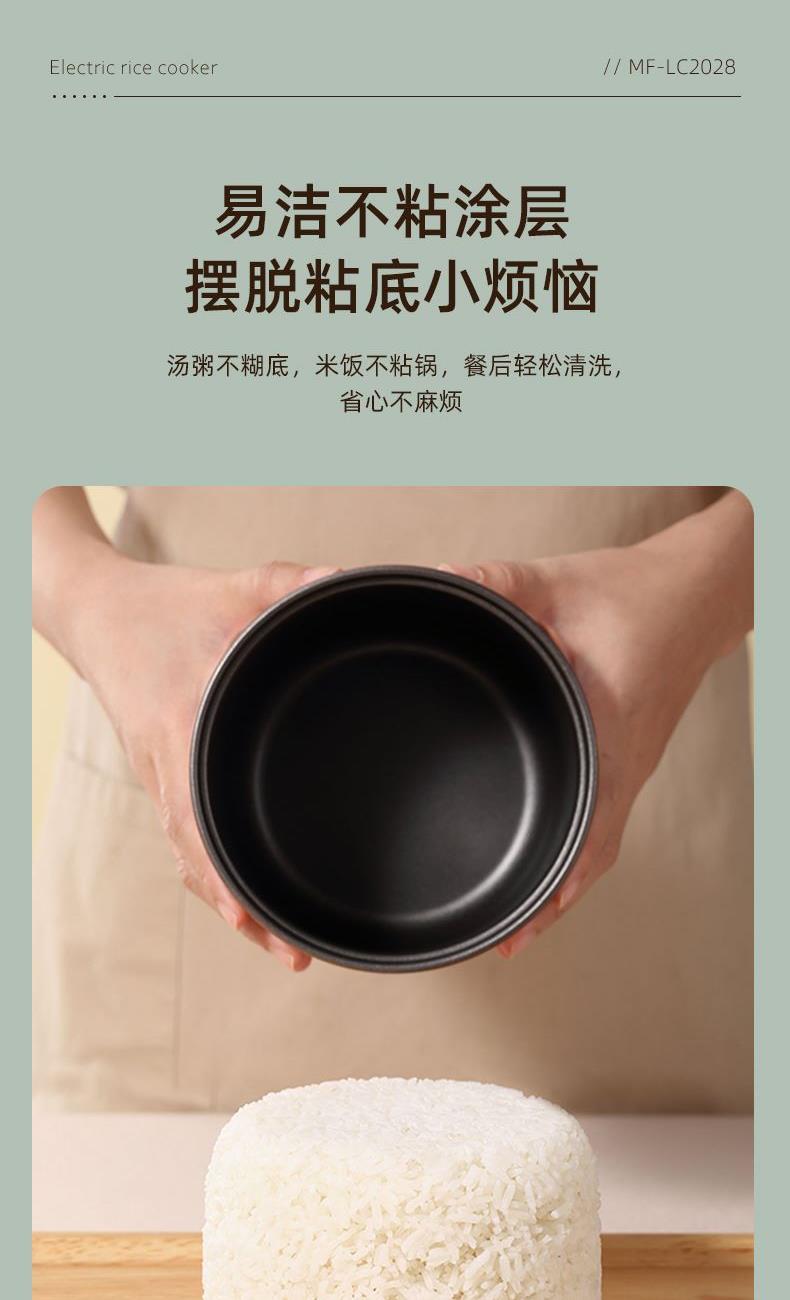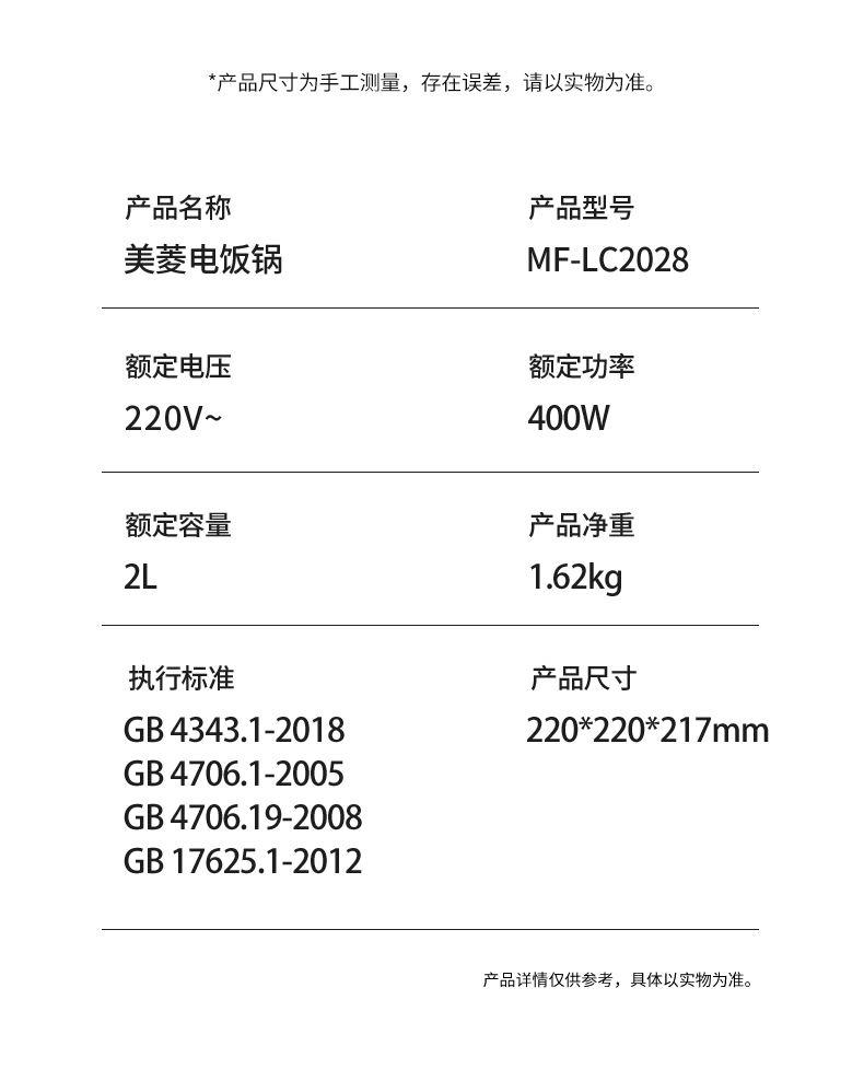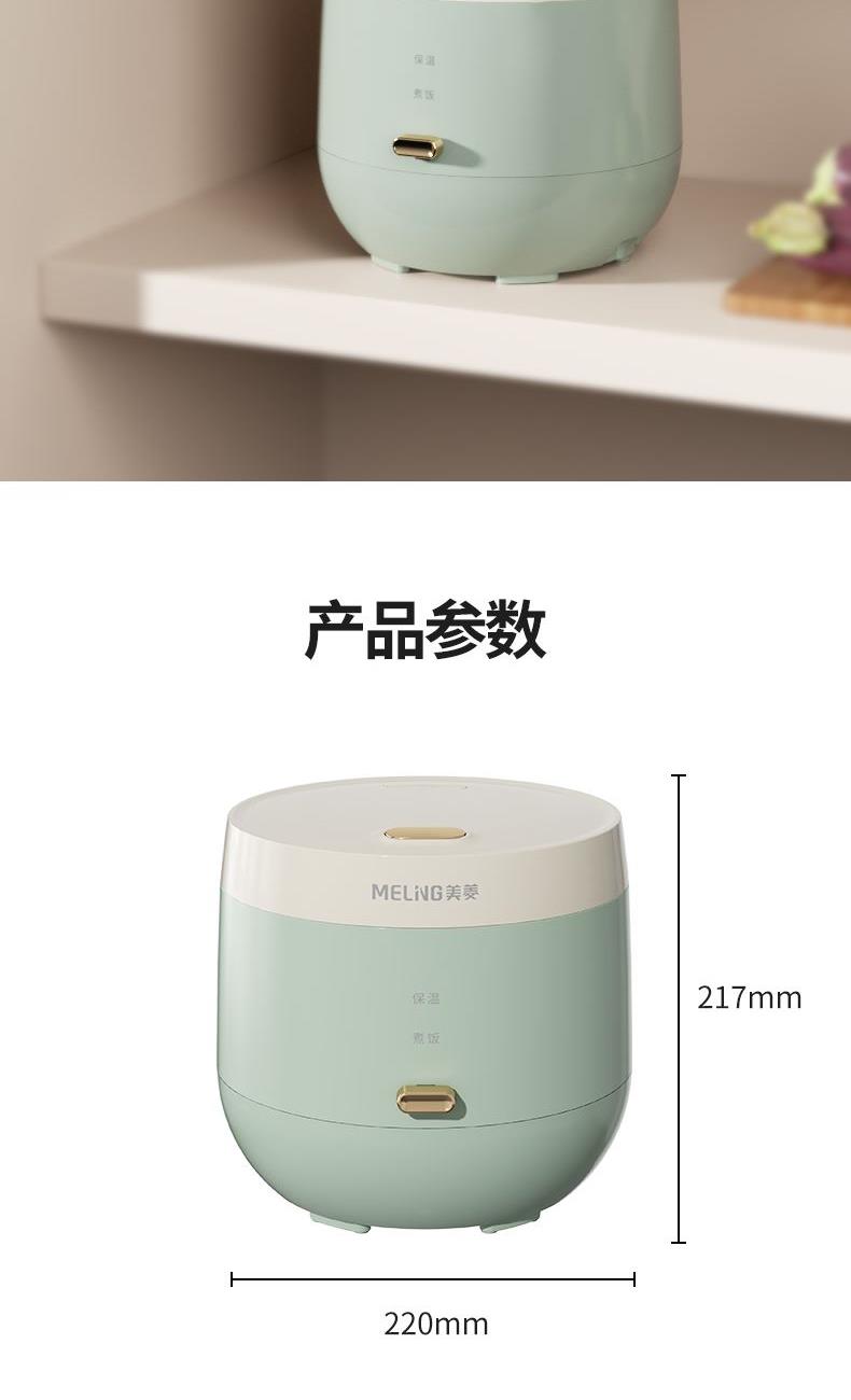 产品尺寸:220*220*217mm 彩包尺寸:265*265*275mm 外箱尺寸:267*267*278mm 单台净重:1.62kg 单台毛重:2.12kg 产品颜色:青白撞色 包装方式:彩盒+电商包 额定电压:220V 额定频率:50HZ 额定功率:400W 额定容量:2L 69码:6936897550479 精致外观,不粘内胆,不易糊底,一冲即净,食物营养易保全 | 一键灵敏操作,即使老人也一用就上手 | 2L容量,精致烹煮 | 全自动保温系统。