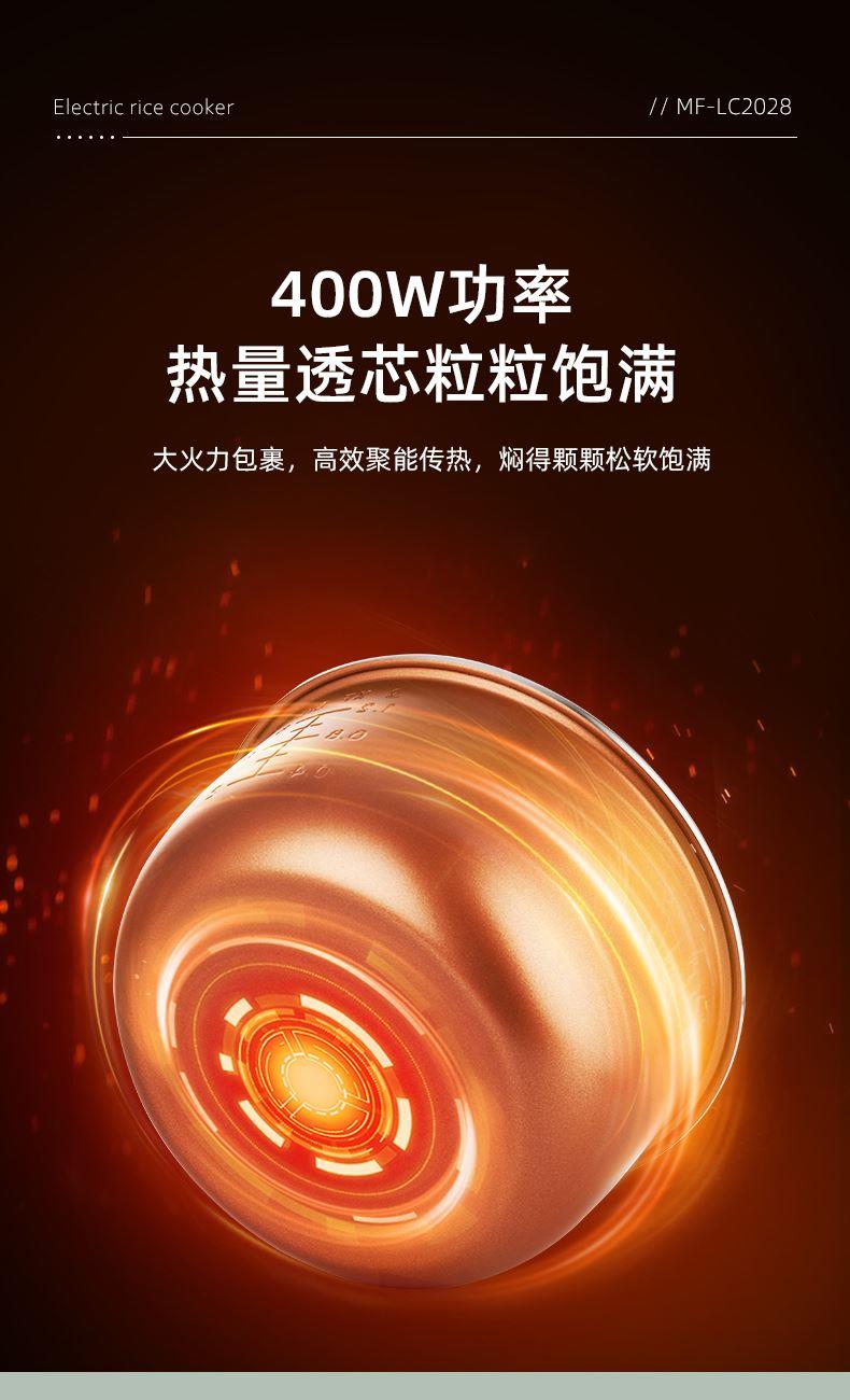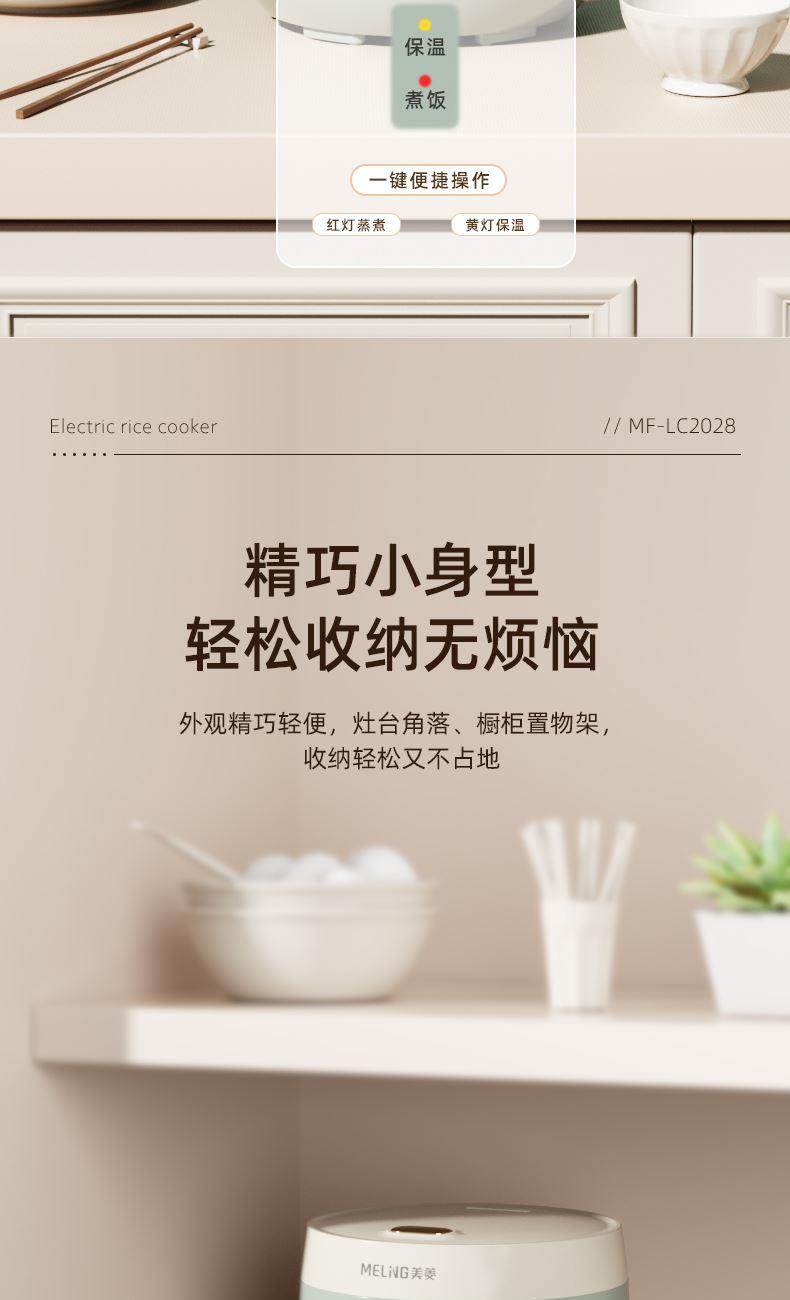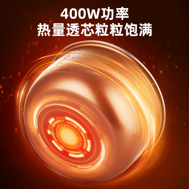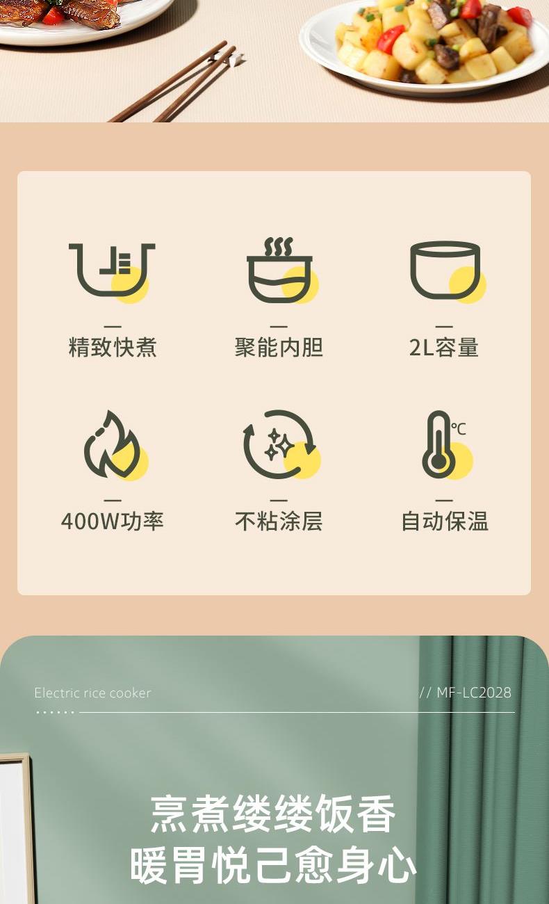 产品尺寸:220*220*217mm 彩包尺寸:265*265*275mm 外箱尺寸:267*267*278mm 单台净重:1.62kg 单台毛重:2.12kg 产品颜色:青白撞色 包装方式:彩盒+电商包 额定电压:220V 额定频率:50HZ 额定功率:400W 额定容量:2L 69码:6936897550479 精致外观,不粘内胆,不易糊底,一冲即净,食物营养易保全 | 一键灵敏操作,即使老人也一用就上手 | 2L容量,精致烹煮 | 全自动保温系统。