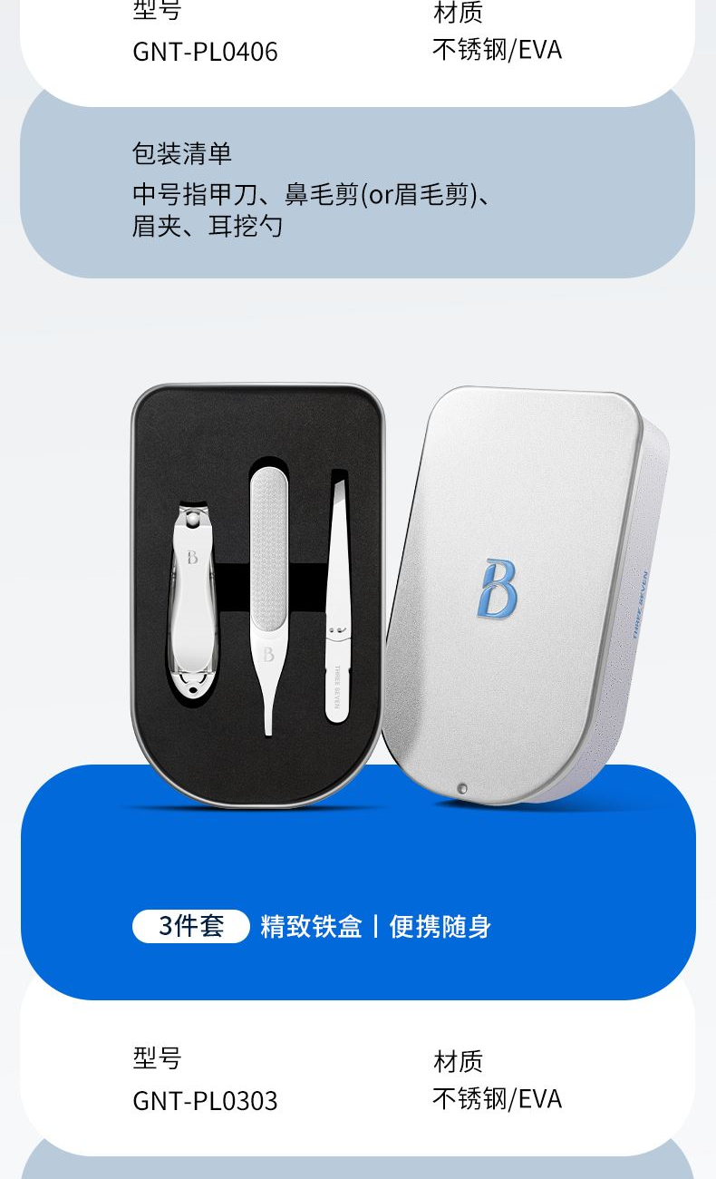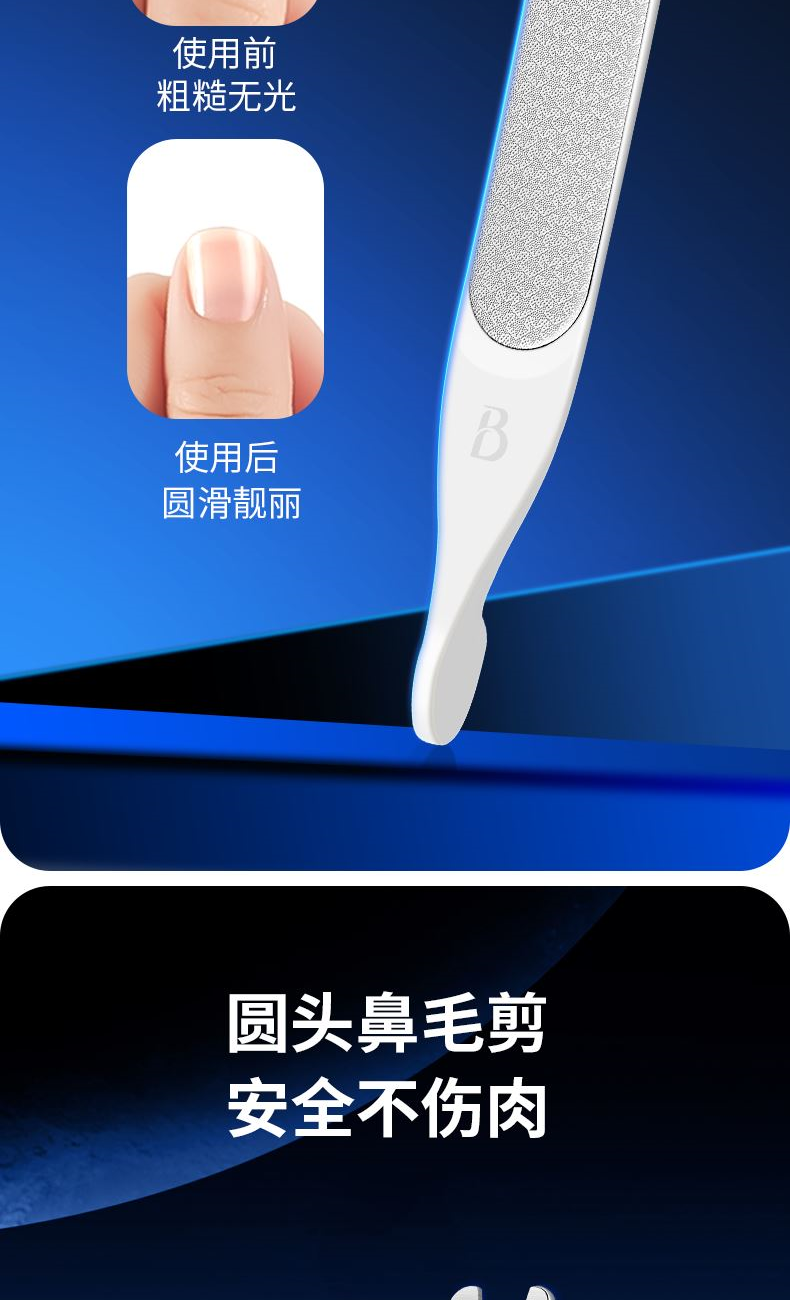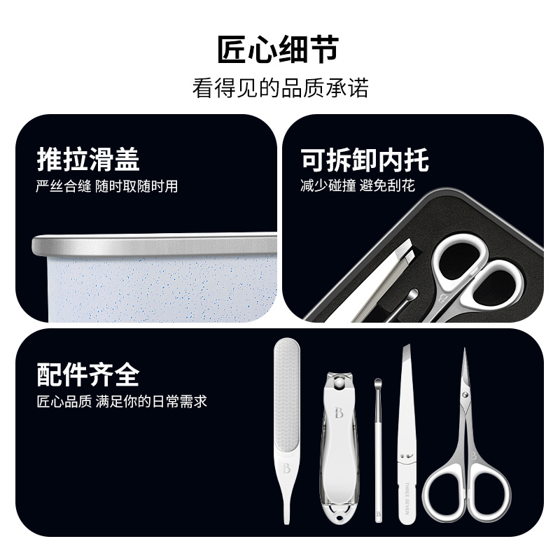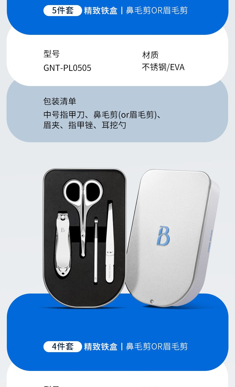 材质:优质不锈钢 规格:160*95*32mm(L) 产品颜色:灰白色 套装内容:5件套 产品配件:平口指甲刀、眉毛剪、耳挖、眉夹、指甲锉 产品特色: 1)实用件套,功能齐全:包含多种美甲工具,从指甲修剪到细节护理,一套满足多样需求,呵护指尖。 2)质感铁盒,精致收纳:采用银白质感铁盒包装,不仅能妥善收纳工具,还尽显简约品味,方便携带且不易损坏工具。 3)品质之选,细节出众:工具做工精细,材质优良,使用顺手,无论是日常自用还是作为礼物,都能展现品质与用心。