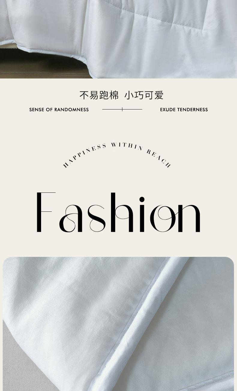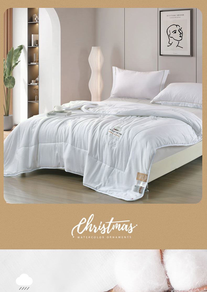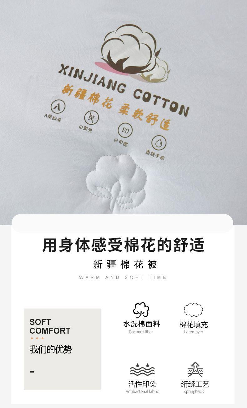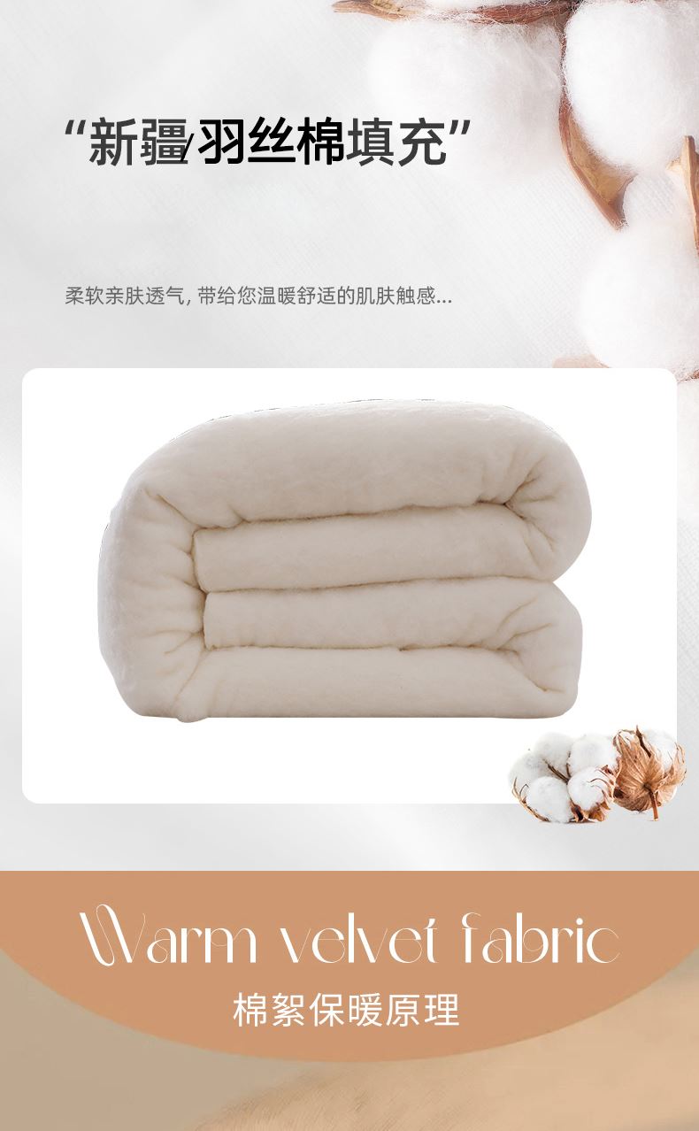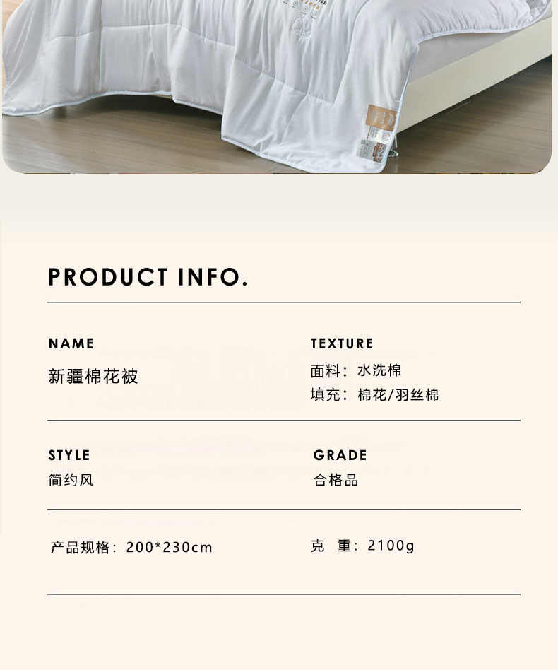 产品规格:200cm*230cm*1 面料成份:水洗棉 填 充 物:棉花/羽丝棉 克 重:2100g 产品说明:水洗棉面料细腻柔软,宠溺肌肤带来整夜酣睡好眠; 闻得到的棉花味,娇肤感知自然柔软像睡在柔软的云层中,气息清新自然,健康环保。