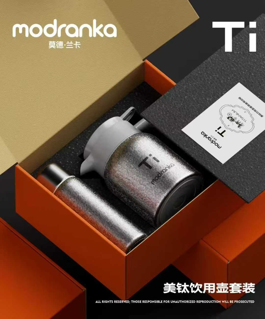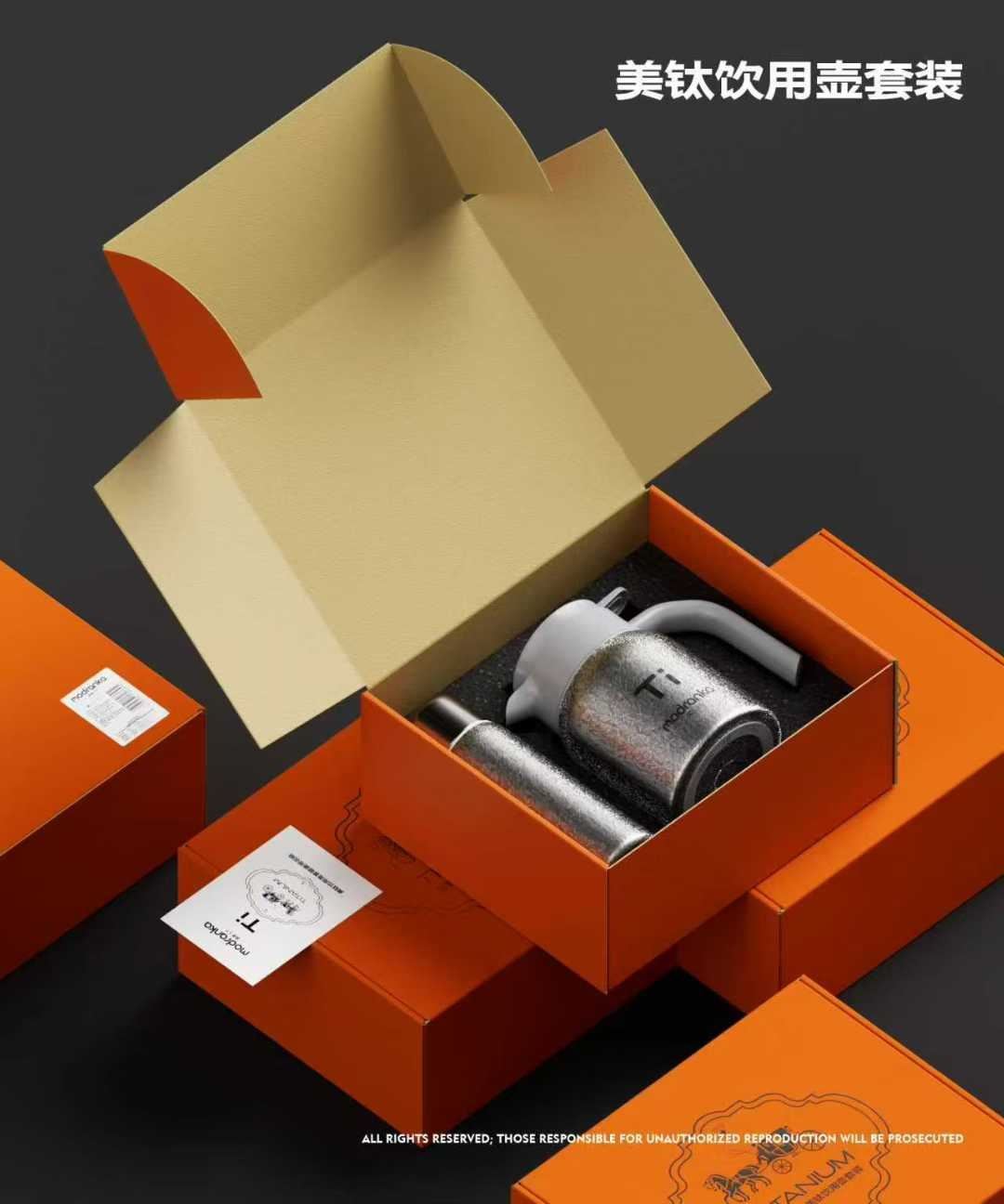 哑光磨砂质感+钛金属原色光泽 钛表面的氧化膜是“天然卫士” 钛的导热性+双层真空设计 钛的耐腐蚀性“天花板”级! 产品容量:水壶 1300ml, 水杯420ml 彩盒尺寸::31.5×13.8×26.5cm 外箱尺寸:65.0×43.0×55.0cm 规格:12套