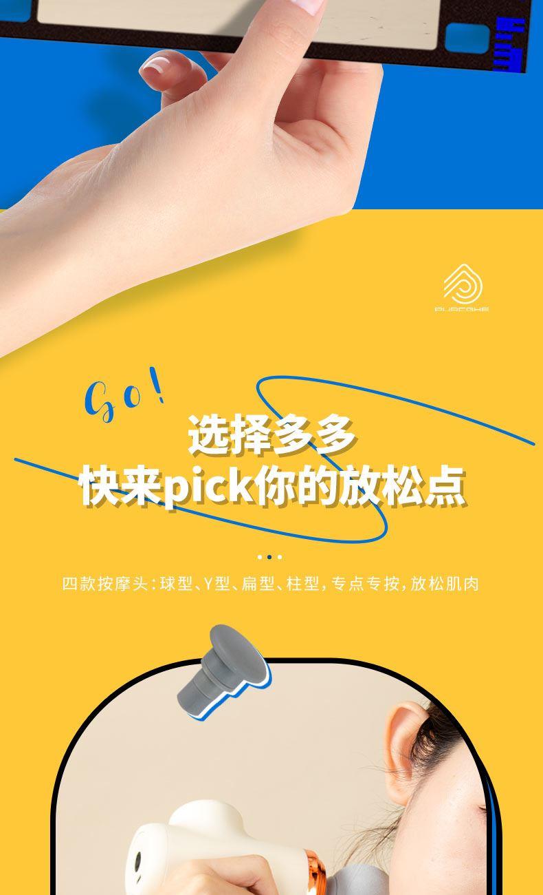 产品特点说明 : 6档力度调节/4款专业按摩头/4小时长续航/TPYE-C口充电/智能按压力度补偿/手感漆面 肌肤触感