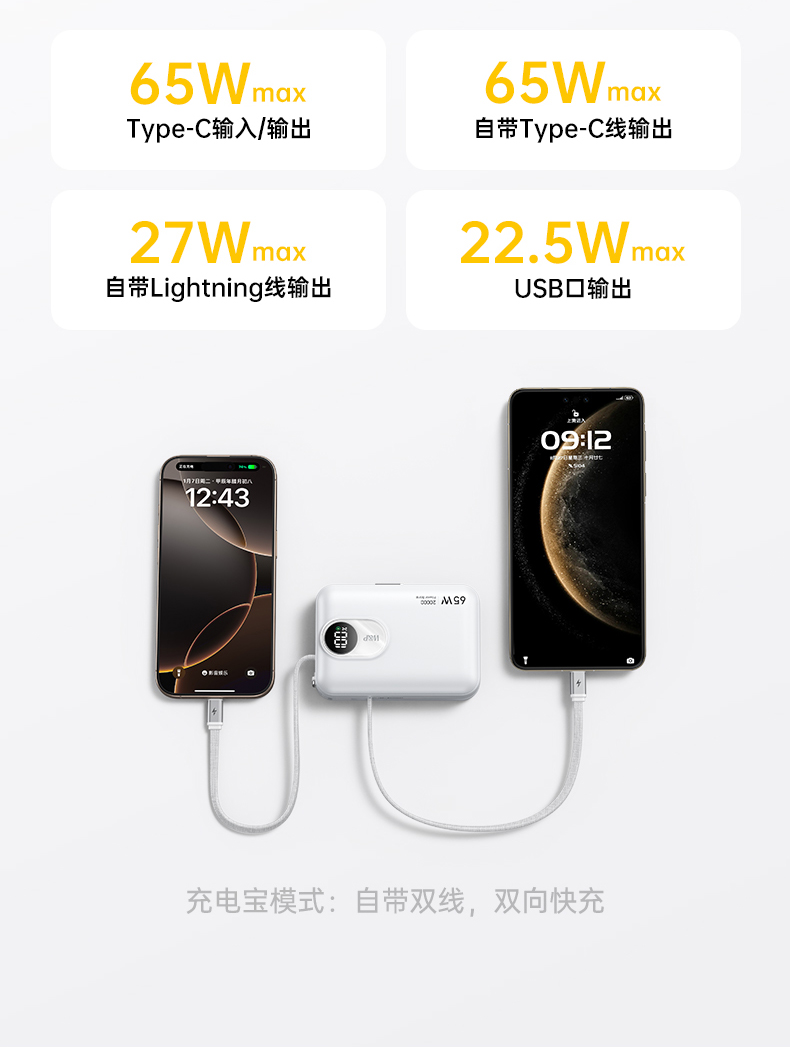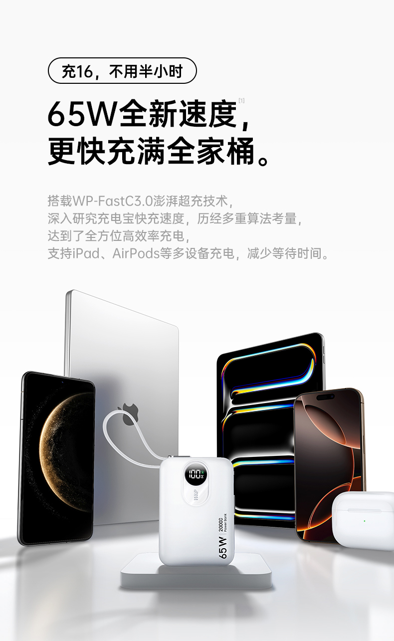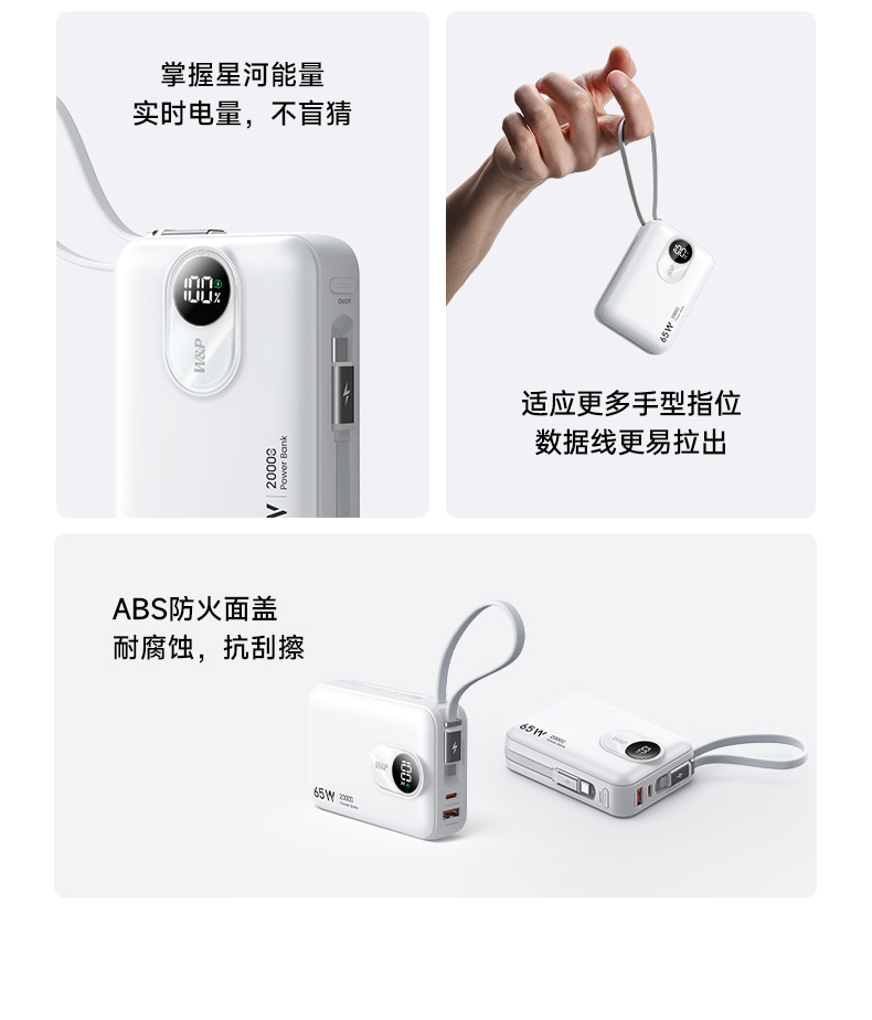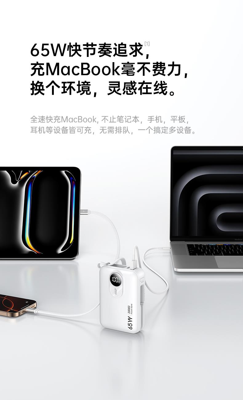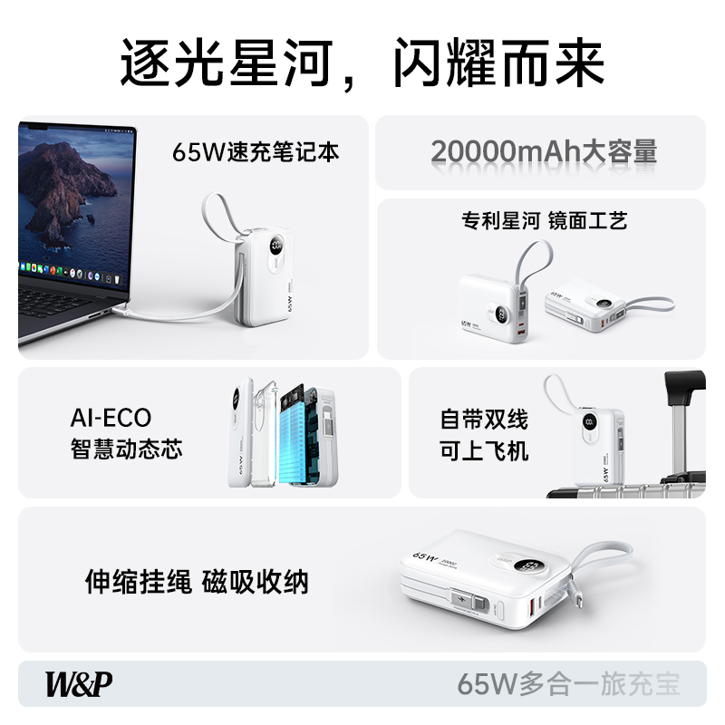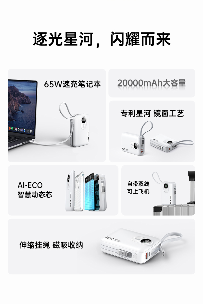 1、 20000毫安大容量,可上飞机 2 、可充平板电脑、笔记本电脑 3、带双线 lightning+type-c双线快充,简单利落 4 、影像数显屏 ,实时跟踪实时电量 5 、快速自充 3小时内可充满充电宝 6 星河镜面工艺,高光美学。