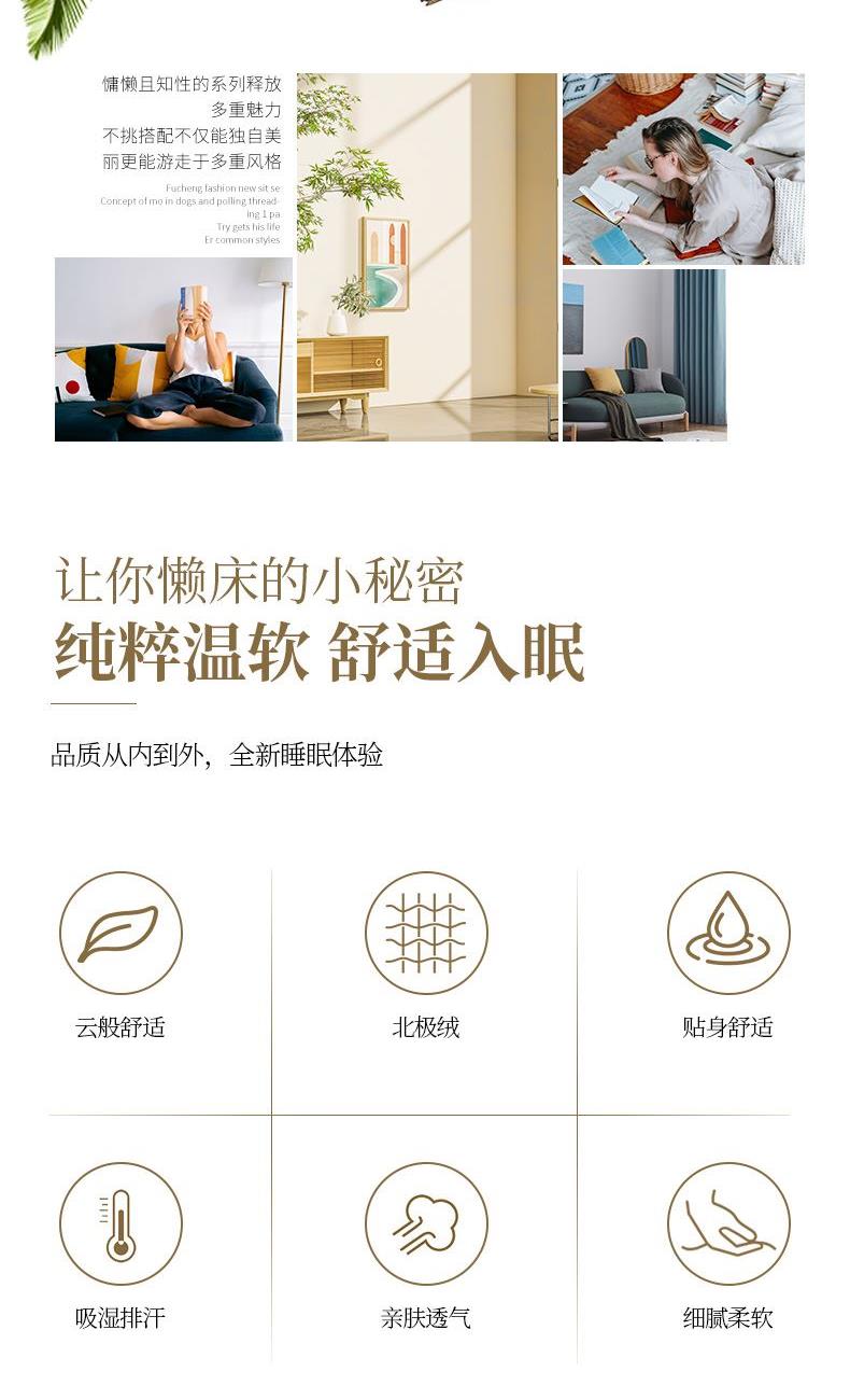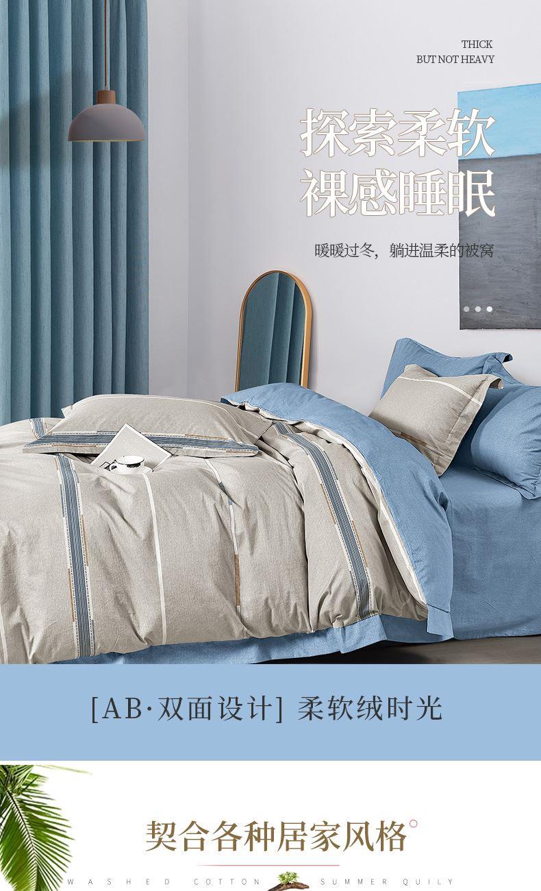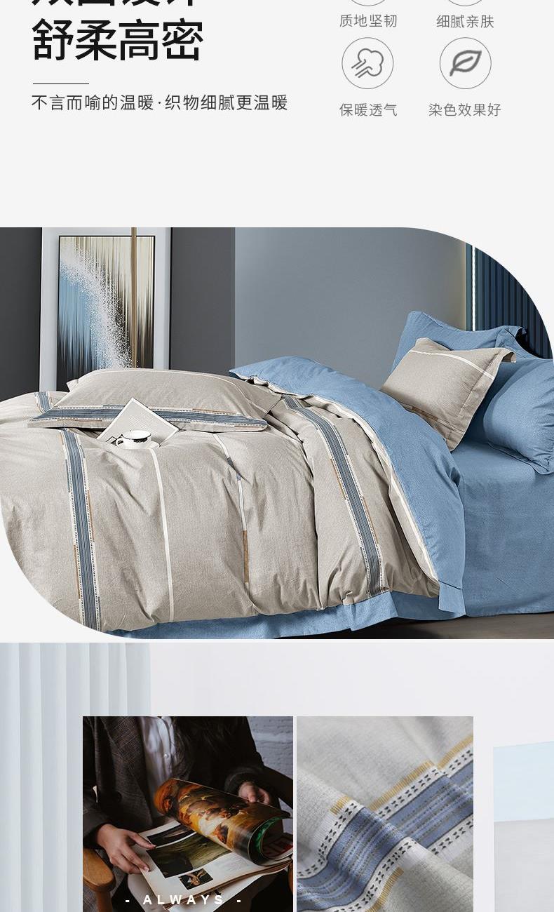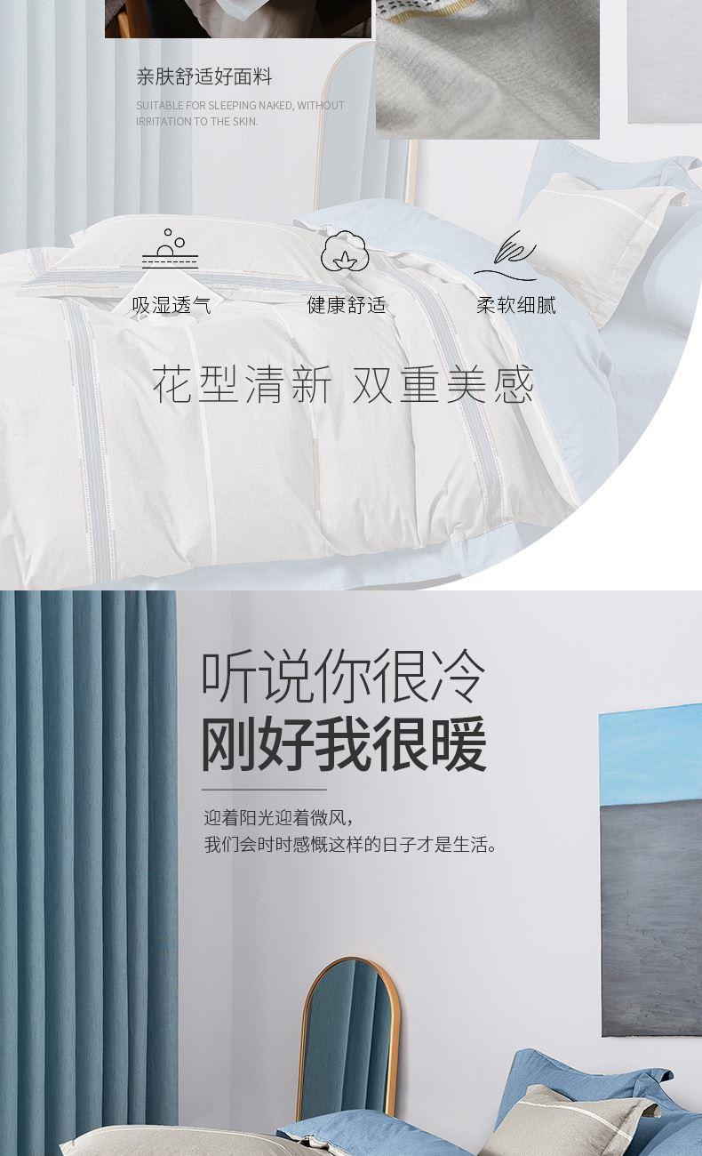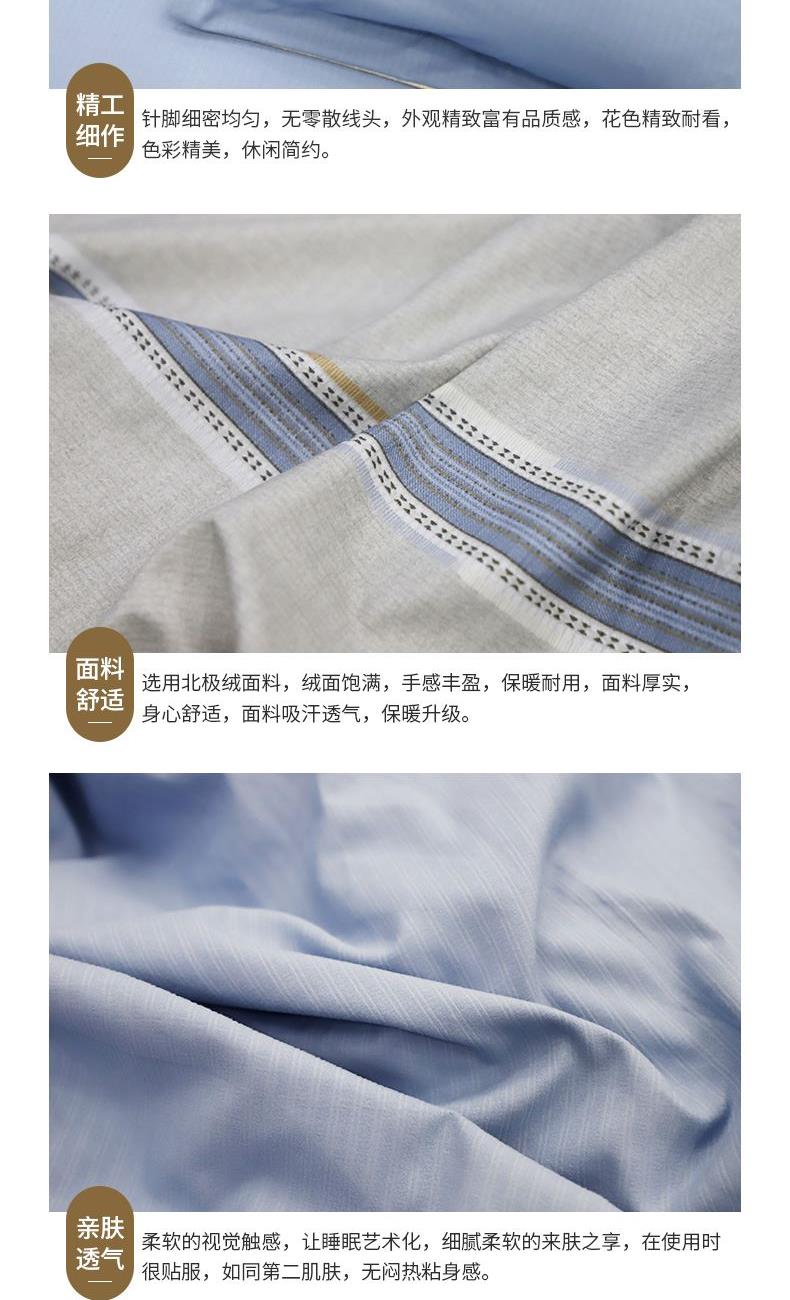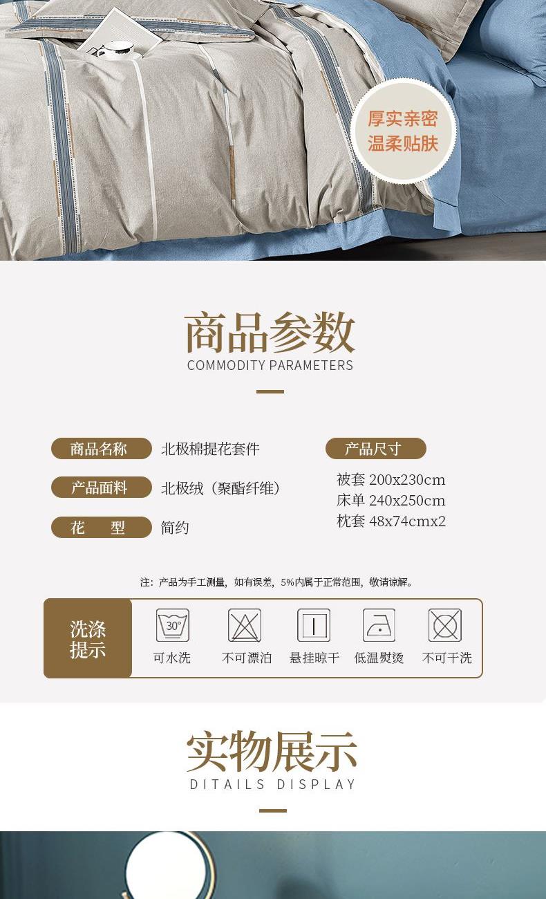 花 型:简约 面 料:北极绒 规 格:被套200×230cm 床单240×250cm 枕套48×74cm×2 AB双版时尚印花设计,甄选会呼吸的北极棉,吸湿透气性强,它的风格独特。手感柔软,舒适亲肤,质感丰厚,绒面丰盈,拥抱阳光般的温暖。